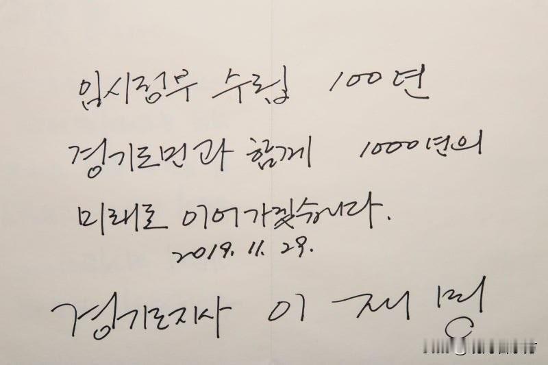 你以为李在明和夫人第一次到中国来?那就错了。你以为李在明和夫人第一次参观韩国临时政府?那也错了。早在2019年,他担任京畿道知事时,首次出国就带着夫人金惠景参观了重庆的韩国临时政府旧址。当时的“李知事”在结束1个多小时的抗日遗址访问后强调:"忘记历史的民族没有未来……"有趣的是,他那次出访中国,行程同样是4天3夜,和这次一模一样,也是最后一站去参观韩国临时政府旧址。 签字的大意是:即将迎来临时政府成立100周年的京畿道居民一起走向一千年的未来!2019年11月29日现在的京畿道知事。