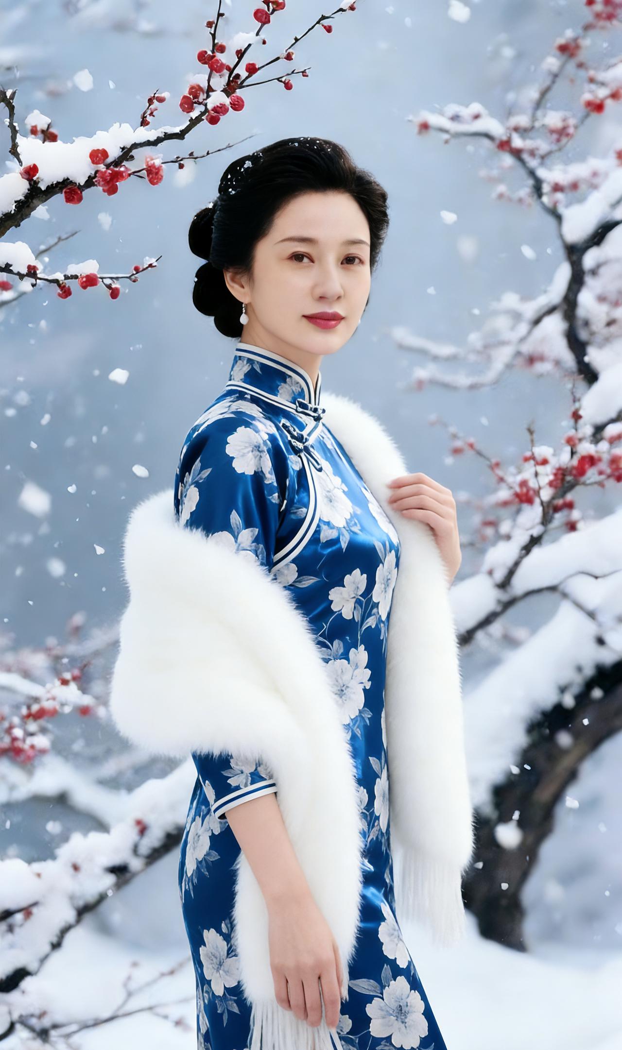 红V领毛衣配白纹围巾,盘发微飘,回眸甜笑百媚生。眼妆精致逼真,皮肤质感细腻,身姿