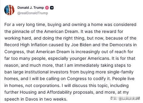 川普称将采取措施,禁止大型机构投资者购买独栋住宅。 “长期以来,购买并拥有一套住房被视为“美国梦”的巅峰象征,是对辛勤工作和正直行为的奖赏。然而如今,由于 Joe Biden 和国会民主党人造成的创纪录高通胀,这一美国梦对太多人——尤其是年轻美国人——变得越来越遥不可及。正因如此,以及更多原因,我将立即采取措施,禁止大型机构投资者继续购买独栋住宅,并呼吁国会将其写入法律。住在房子里的是人,而不是公司。两周后,我将在达沃斯发表演讲,进一步阐述这一议题,包括更多住房与可负担性提案及其他内容。”