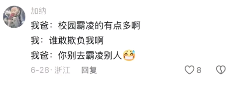 我爸:校园霸凌的有点多啊 我:谁敢欺负我啊 我爸:你别去霸凌别人