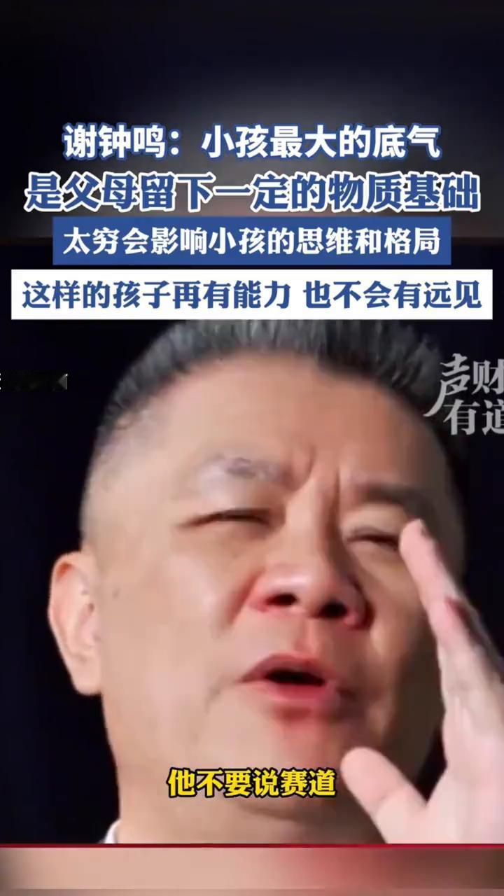 谢钟鸣:小孩最大的底气是父母留下一定的物质基础。 太穷会影响小孩的思维和格局,这样的孩子再有能力也不会有远见。 为什么小镇青年能本科毕业?他来到了深圳,为什么他比不过在深圳本地的也同样本科毕业的?不是他能力不行,因为他的所有的精力都让他只能放在眼前的事情上,他老是困在下个月的米缸的米在哪里,没法想长远,只能想着这个星期的工怎么打好,怎么把老板给我的这点钱赶紧结了,我要糊口,他只能考虑下个月对他来说就是很长的期限了。 但是如果家里在深圳有住房的,不愁下个月的饭在哪里的,他可以考虑一年、三年、五年的事情,我考虑这个行业适不适合我,我是不是要换一个赛道,但是如果没有这个物质条件的,他不要说赛道,他换这个工作的资格都没有,如果换换工作,他可能明天晚上的晚饭都成问题。最好的是给孩子留有一点过上体面生活的物质条件。