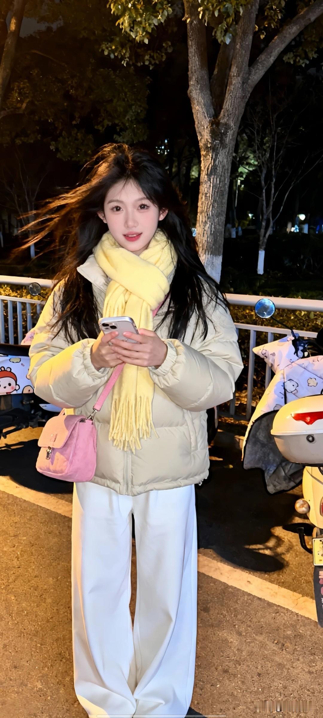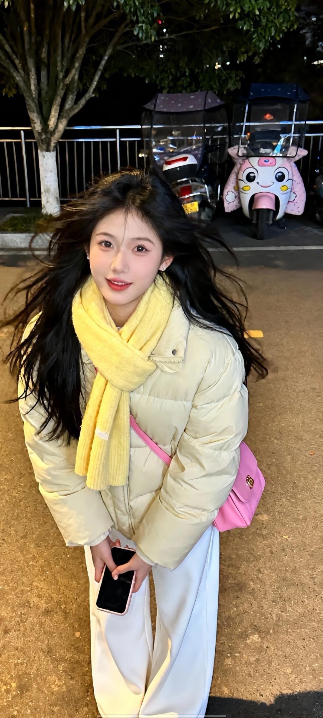 黑色长发 浅米色羽绒服,白色阔腿裤,黄色围巾,粉色挎包,手持手机,夜晚户外场景(背景有树木、栏杆、停放的卡通图案电动车,光线柔和) 尖下巴,三庭五眼比例均衡,身材娇小,娇羞可爱的随机表情,细腻陶瓷水嫩肌肤,偏冷白皮,低画质 ,上半身特写,随机的妆容,随机发型和颜色,随机的饰品,随机的动作,发丝轻飘,凌乱,随机角度拍摄,总体有很多的不确定性,但又好看,, 灯光自拍视角最高等级画质,美颜全开。