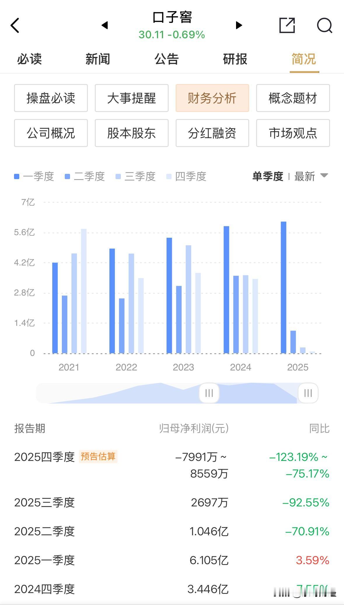 白酒行业首家业绩预告出炉,口子窖同比净利润同比下滑50%-60%, 而其四季度净利润约为-0.8亿元至0.85亿元区间,极限可能存在亏损。 这份业告,应该是白酒行业行业的至暗时刻到了! 整个白酒行业,除了龙头企业之外,估计都将陷入这种状态,头部企业下调价格,挤压的就是二、三线白酒品牌的利润空间。 唯一的方式就是将其高端品牌的价格降至普通百姓消费的起水平,以量取胜。 乐呀财经