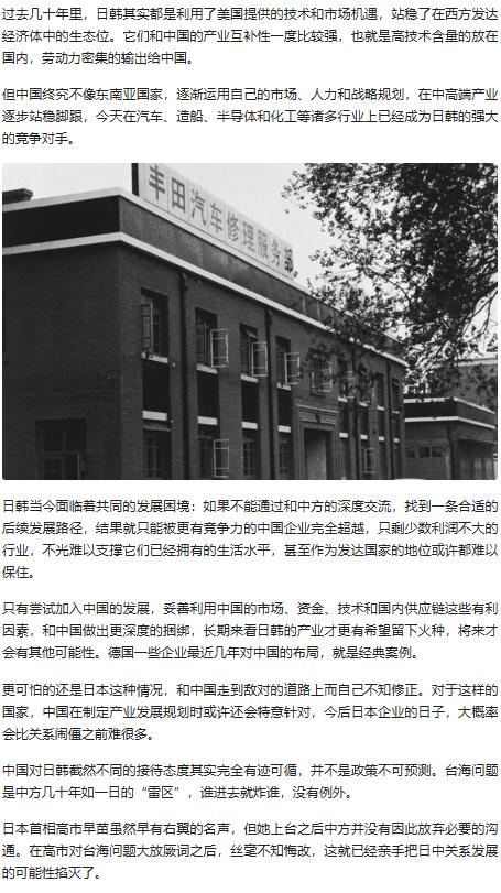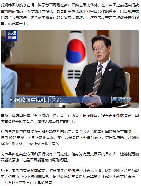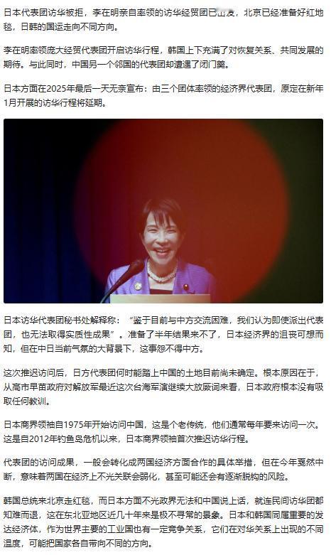 又到每日读文时刻,今天刷到一个文章,来自唐驳虎主笔所写的日本代表团访华被拒,但中国却给李在明备好红地毯,看到这个标题,大家是什么想法呢? 中国对日韩访华代表团的不同态度,背后是国家立场与历史经纬的双重考量。 李在明率团获红地毯礼遇,日本代表团却无奈延期,两国国运走向似现分野。 文章点出中日韩产业竞争与互补的深层逻辑,也揭露了日本右翼操弄台海问题的恶果。 但令人好奇的是,即便高市早苗下台,日本要修复对华关系需付出多少实质努力? 韩国又能否借此次访华机遇,在与中日的博弈中稳操胜券? 期待作者后续更新内容!!