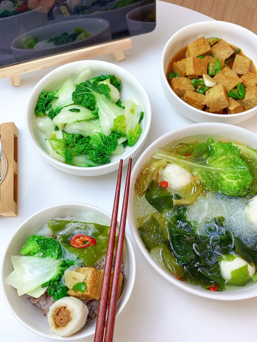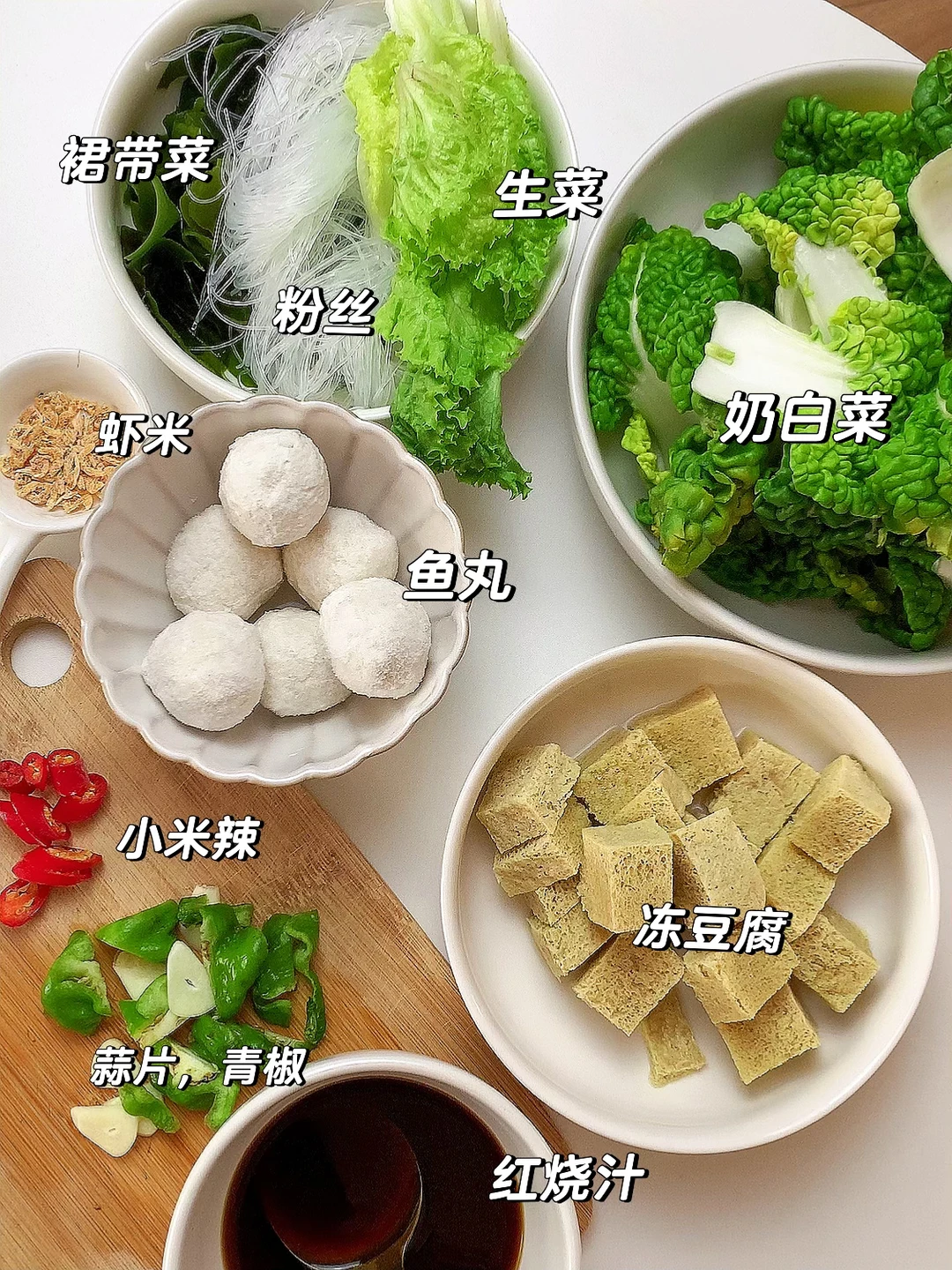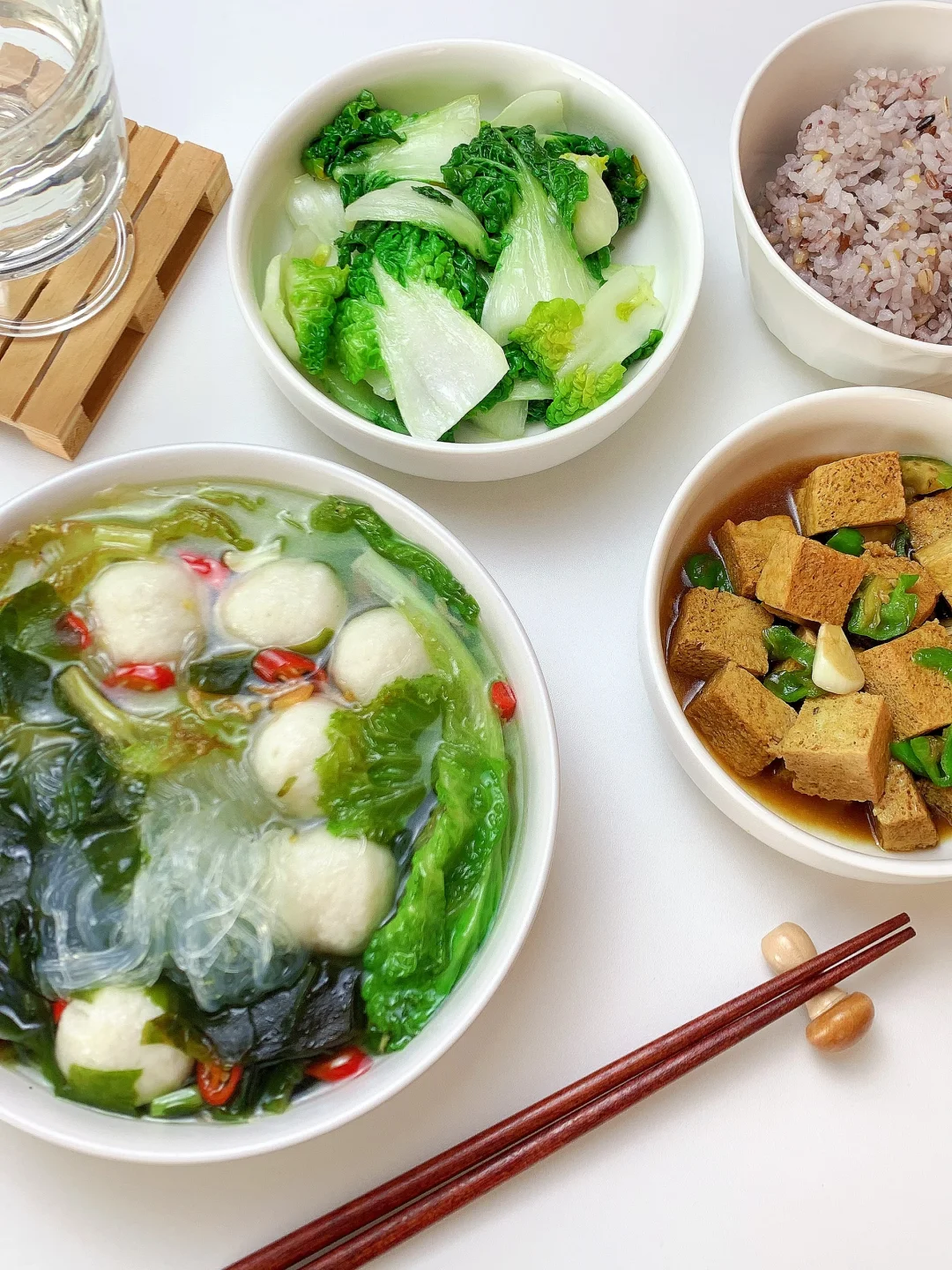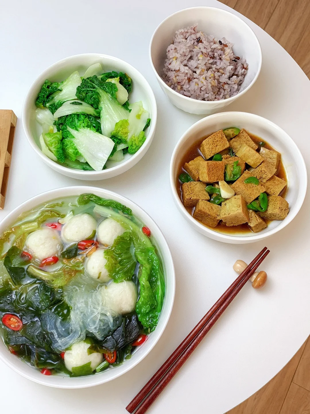 👩🏻🍳分享今日菜单 [一R]清炒奶白菜 [二R]红烧冻豆腐 [三R]裙带菜粉丝鱼丸汤 主食:米饭🍚 ……………………………………………………………………………… 🛒食材清单: 鱼丸 | 粉丝 | 裙带菜 | 奶白菜🥬 | 冻豆腐 ✨红烧汁:一勺生抽,半勺老抽,半勺蚝油,半勺淀粉,半勺白糖,少许盐,少许清水搅匀~ 📝我的美食日记,一日三餐,拒绝外卖[偷笑R],坚持做饭的每一天,吃简单干净的饭菜~ ₍˄·͈༝·͈˄*₎◞ ̑̑