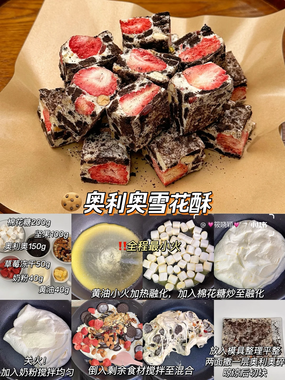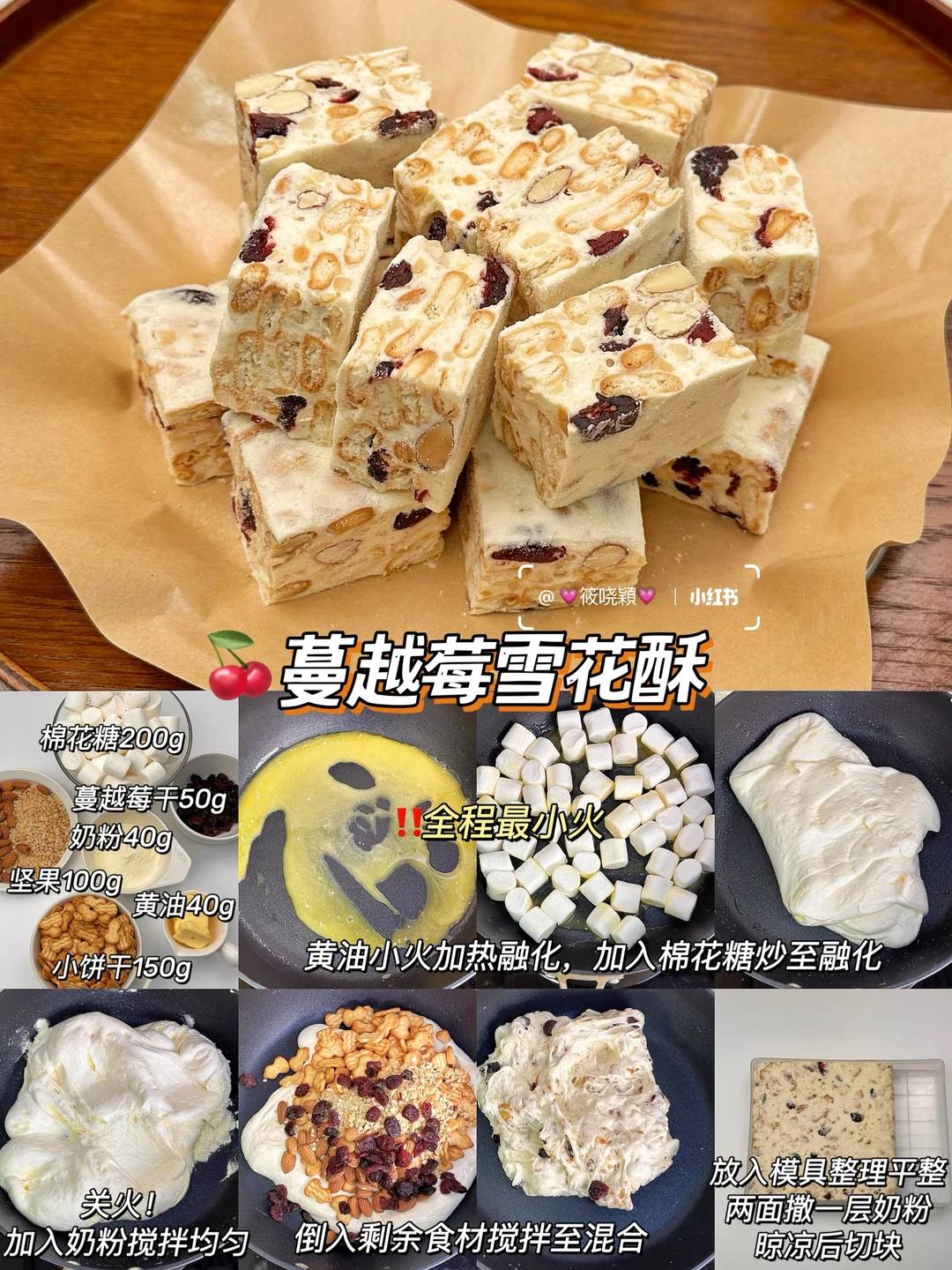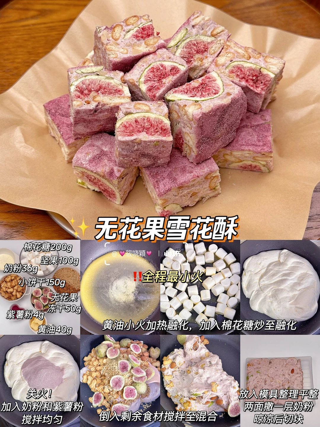 只需要搅一搅就能成功的雪花酥! 不要再说你不会啦,这个配方我做过好多次了 零失败! 酥酥脆脆 真的超好吃❗️ 安排起来,过年还能当新年伴手礼~ - 🍓草莓雪花酥 【棉花糖200g,小饼干150g,混合坚果100g,草莓冻干50g,黄油40g,奶粉36g,草莓粉4g】 🍒蔓越莓雪花酥 【棉花糖200g,小饼干150g,混合坚果100g,蔓越莓干50g,黄油40g,奶粉40g】 🥭芒果雪花酥 【棉花糖200g,小饼干150g,混合坚果100g,芒果干100g,黄油40g,奶粉40g】 ✨无花果雪花酥 【棉花糖200g,小饼干150g,混合坚果100g,无花果冻干50g,黄油40g,奶粉36g,紫薯粉4g】 🍪奥利奥雪花酥 【棉花糖200g,奥利奥150g,混合坚果100g,草莓冻干50g,黄油40g,奶粉40g】 🍃抹茶雪花酥 【棉花糖200g,小饼干150g,混合坚果100g,无花果冻干50g,黄油40g,奶粉36g,抹茶粉4g】 - ⚠️雪花酥口感的关键就是炒棉花糖那步,一定要最小火,融化后没有大颗粒了就关火,好的状态应该是柔软蓬松的,不要炒太久会发硬 ⚠️一定要用不粘锅,如果没有,用有不沾涂层的电饭煲或者小奶锅也可以 ⚠️放凉了再切块,切块后密封袋装好常温可以储存一个月