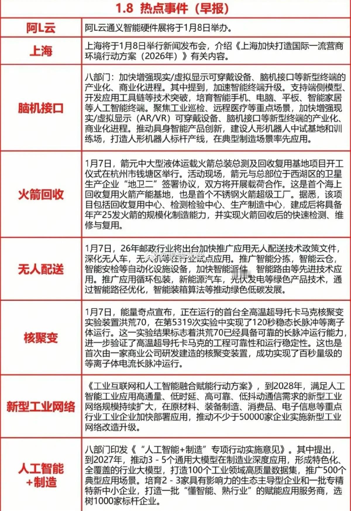 今日财经热点事件!1.阿里云2.脑机接口3.火箭回收4.无人配送5.核聚变