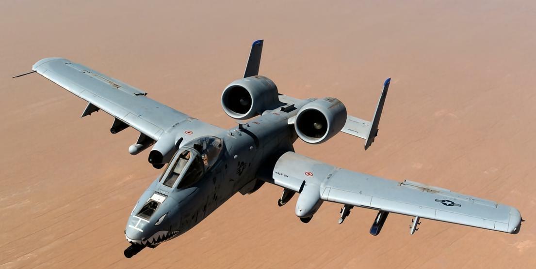 美国A-10“雷电Ⅱ”攻击机 A-10是美国费尔柴德公司研制的双发单座攻击机,绰号“雷电Ⅱ”(ThunderboltⅡ)。 A-10攻击机采用中等厚度大弯度平直下单翼、双垂尾的正常布局,不仅便于安排翼下挂架,而且有利于遮蔽发动机排出的火焰与气流,以抑制红外制导的地对空导弹的攻击。尾吊发动机不仅可以简化设计、减轻结构重量,在起降时还可最大限度避免发动机吸入异物。两个垂直尾翼增加了飞行安定性,作战中即使有一个垂尾遭到破坏,飞机也不会无法操纵。 A-10攻击机在低空低速时有优异的机动性,可以在相当短的跑道上起飞及降落,并能在接近前线的简陋机场运作,因此可以在短时间内抵达战区。其滞空时间相当长,能够长时间盘旋于任务区域附近并在300米以下的低空执行任务。A-10攻击机在前机身内左下侧安装了1门30毫米GAU-8型7管“加特林”机炮,最大备弹量1350发。该机有11个外挂架(每侧机翼下4个,机身下3个),最大载弹量为7260千克。