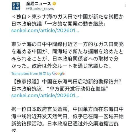 日本又迎来一个大噩耗!中国开始在东海日中航线附近开发天然气田! 1月7日,根据日本产经新闻报道,日媒称,一名日本政府官员表示,中国正“单方面”在东海日中航线附近开发天然气田,中国似乎已在同一区域开始新的钻探活动。而对此,日本政府已通过外交渠道提出抗议。目前,中国已建成永久性钻井设施,这样的行为让人担心开采活动会加速,日本政府保持高度戒备。 但这事得掰扯清楚,中国在这片海域开发天然气田,根本不是什么“单方面”行为,而是完全在自己的合法管辖范围内行事,日本的抗议纯属无理取闹。 从法律和主权层面说,中国的开发行为有充分依据。根据《联合国海洋法公约》,沿海国对其大陆架内的自然资源享有勘探和开发的主权权利,而大陆架的划分应遵循自然延伸原则。中国一直主张,东海大陆架自然延伸到冲绳海槽,以西的海域都属于中国的管辖范围,这一主张完全符合国际法准则。 反观日本,一直单方面主张以“日中中间线”划分东海海域,这个主张既没有国际法依据,也没有得到中国的承认。事实上,中国外交部早就明确回应过,中方在东海的油气开发活动位于毫无争议的中方管辖海域,不接受日方的无端指责,并且已经驳回了日方的所谓抗议。 而且中国在东海开发天然气田并不是突然之举,早有成熟的开发历史和明确的规划。早在上世纪90年代,中国就和上海市联合开发了东海平湖油气田,这个气田最高日产油能达到3000吨,日产天然气180万立方米,已经实现了稳定产出。 2000年之后,中国又投入开发春晓天然气田群,圈定了38个油气沉积盆地,初步计算的油气资源量达到400亿吨以上的油当量,2005年10月春晓油气田建成投产,日处理天然气能力就有910万立方米。 2019年,平湖油气田的团结亭构造团三断块钻探还新发现了油气资源,探明天然气地质储量2.9亿立方米,进一步提升了该区域的稳产增量水平。这次在日中航线附近的开发,只是中国东海油气开发规划的延续,是对合法资源的合理利用。 从资源需求来看,东海天然气田的开发对中国有着重要的现实意义。东海海域的天然气资源品质优良,开发后主要供应江浙沪等经济发达地区。以春晓气田群为例,其生产的天然气通过350公里的海底输气管道送往宁波的陆上处理厂,再销往浙江及邻近省市,同时还能作为上海地区的备用气源,缓解这些地区的能源紧张问题。 随着经济的持续发展,这些地区对清洁能源的需求不断增加,东海天然气田的开发能有效保障能源供应稳定,减少对外部能源的依赖,这是任何一个国家都会优先考虑的民生和发展需求。 再看日本的抗议,背后其实是对东海资源的焦虑和地缘利益的考量。日本是一个资源匮乏的国家,大部分能源和矿产资源都依赖进口,所以一直把东海视为重要的资源储备地。 早在上世纪末,日本就制定了“海底资源能源确保战略”,计划在东海海域开发含有稀有金属的海底热水矿床,力争实现产业化,但因为中日在海域划界上的争议,这个计划一直难以推进。中国在东海的合法开发活动,让日本担心自己觊觎的资源份额受到影响,所以才频频跳出来抗议。 另外,日中航线是重要的国际航运通道,日本担心中国在这一区域的开发活动会影响其航运利益,但实际上中国的开发设施都建在自己的管辖海域内,完全不会影响正常的航运秩序。 总的来说,中国在东海日中航线附近开发天然气田,是行使自身主权权利的正当行为,有充分的法律依据和现实需求,而且有长期的开发历史和成熟的技术支撑。日本的无端抗议,本质上是对中国主权的不尊重,也是出于自身资源焦虑的过度反应。 中方已经明确驳回了日方的抗议,未来也会继续在自己的管辖海域内开展合法的资源开发活动。希望日本能认清现实,摒弃对抗思维,按照之前达成的原则共识,通过对话协商解决东海问题,而不是频频制造事端。