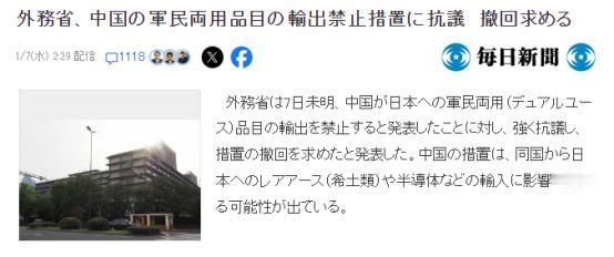 1月7日凌晨,日本向中国发出抗议,据《每日新闻》报道,日本外务省对中方宣布禁止向日本出口军民两用物项一事,提出强烈抗议,并要求中方撤回该措施。 要搞清楚这事儿的来龙去脉,得先回到1月6日。当天,中国商务部发布了2026年第1号公告,明确宣布加强对日本的军民两用物项出口管制,核心内容就是禁止所有军民两用物项对日本军事用户、军事用途,以及一切有助于提升日本军事实力的其他最终用户用途出口。 而且公告还特别强调,不管是哪个国家或地区的组织、个人,只要敢违反规定,把原产于中国的相关物项转移或提供给日本,都会依法追究法律责任,并且这份公告从发布之日起就正式生效,没有给日方任何缓冲的余地。 熟悉国际经贸和地缘政治的人都知道,所谓“军民两用物项”,可不是什么普通商品,而是那些既能用在民用领域,又能直接服务于军事领域、提升军事实力的物资、技术和服务。 按照中国现行的管制清单,这范围涵盖了核、生化、导弹、常规武器、先进电子、战略材料等八大类,足足138页的清单,每一项都戳中了现代军工生产的要害。 而日本《每日新闻》也看得很明白,直接点出中方这次的禁令,就是对日本近期一系列涉台错误言论的强力回击,这话说得一点没毛病,中方的反制从来都不是无的放矢,而是日方步步紧逼后的必然结果。 谁都清楚,台湾问题是中国的核心利益,是碰不得的红线。可最近一段时间,日本右翼势力在涉台问题上越发嚣张,完全不把中方的严正警告放在眼里。 日本首相高市早苗多次公然发表涉台错误言论,甚至暗示要武力介入台海局势,这已经严重违背了一个中国原则,粗暴干涉了中国内政,也彻底破坏了中日关系的政治基础。 早在去年12月4日,中国商务部新闻发言人就已经亮明态度,敦促日方立即纠正错误言行,否则中方将采取必要措施,一切后果由日方承担。 可日方对此置若罔闻,不仅没有收敛,反而变本加厉,自民党代理干事长萩生田光一还在2025年12月21日窜访台湾,和“台独”分裂势力头目赖清德密会,之后更是放风说近30名日本国会议员要在2026年初集体“访台”。 在这种情况下,中方出台针对性的反制措施,完全是维护国家主权和安全的正当之举,于法有据,于理应当。 日方现在跳出来抗议,说什么“此次专门针对日本的措施,与国际惯例存在巨大差异,无法容忍,令人极为遗憾”,这话听着就可笑。 日本外务省亚洲大洋洲局局长金井正彰还特意召见中国驻日大使馆公使,摆出一副受害者的姿态,要求中方撤回措施,这纯属倒打一耙。要知道,中国对本国出口物项实施管制,依据的是《中华人民共和国出口管制法》等国内法律法规,目的是维护国家安全和利益、履行防扩散等国际义务,这是主权国家的正当权利,任何国家都无权干涉。 而且国际上各个主权国家都有类似的出口管制制度,日方自己也有一套严格的出口管制体系,现在却拿“国际惯例”说事儿,根本就是双重标准,说白了就是想继续在涉台问题上挑衅,又不想承担任何后果。 更有意思的是,日方之所以反应这么激烈,核心原因还是中方的这一措施,正好打在了日本的“七寸”上。《每日新闻》也坦言,中方的禁令将对日本从中国进口稀土、半导体等产品产生严重影响。 这可不是危言耸听,长期以来,日本在关键战略材料和半导体基材领域,对中国的依赖度高得惊人。就拿稀土来说,虽然2010年之后日本一直在努力降低对华依存度,但到2023年,其进口稀土中来自中国的占比仍超过60%,尤其是用于制造高端武器和精密设备的中重稀土,比如镝、铽等,几乎100%依赖中国供应。 这些中重稀土是日本03式地对空导弹、苍龙级潜艇无轴泵推系统的核心材料,没有高性能稀土磁体,日本的高端军工生产线基本上就得“停摆”。 除了稀土,半导体领域的依赖更是致命。日本自卫队的通信装备、雷达、导弹制导芯片等关键军事装备,高度依赖中国产的镓、锗、碳化硅、氮化镓等半导体材料,而全球90%以上的高纯砷化镓/氮化镓都来自中国,一台现代军用相控阵雷达就需要几百克这类材料。 而且中方这次的禁令不仅禁物资,还禁技术、禁服务、禁数据、禁交易,甚至实现了“长臂管辖”,任何第三国敢转供相关物项给日本,都会被依法追责,这就彻底堵死了日本想通过中转规避管制的路子。 日本野村综合研究所早就做过评估,要是中国对日稀土出口限制持续一年,日本年名义和实际GDP将减少0.43%,更别说这次禁令覆盖的是所有军民两用物项,对日本军工产业的打击可想而知。 值得注意的是,中方这次的措施其实还留有余地,禁令仅限“军事用途”,民用贸易理论上可以照常。 这就意味着,只要日方能够悬崖勒马,停止在涉台问题上的挑衅,撤回错误言论,不再试图干涉中国内政,中日之间的正常经贸合作仍有维持的空间。