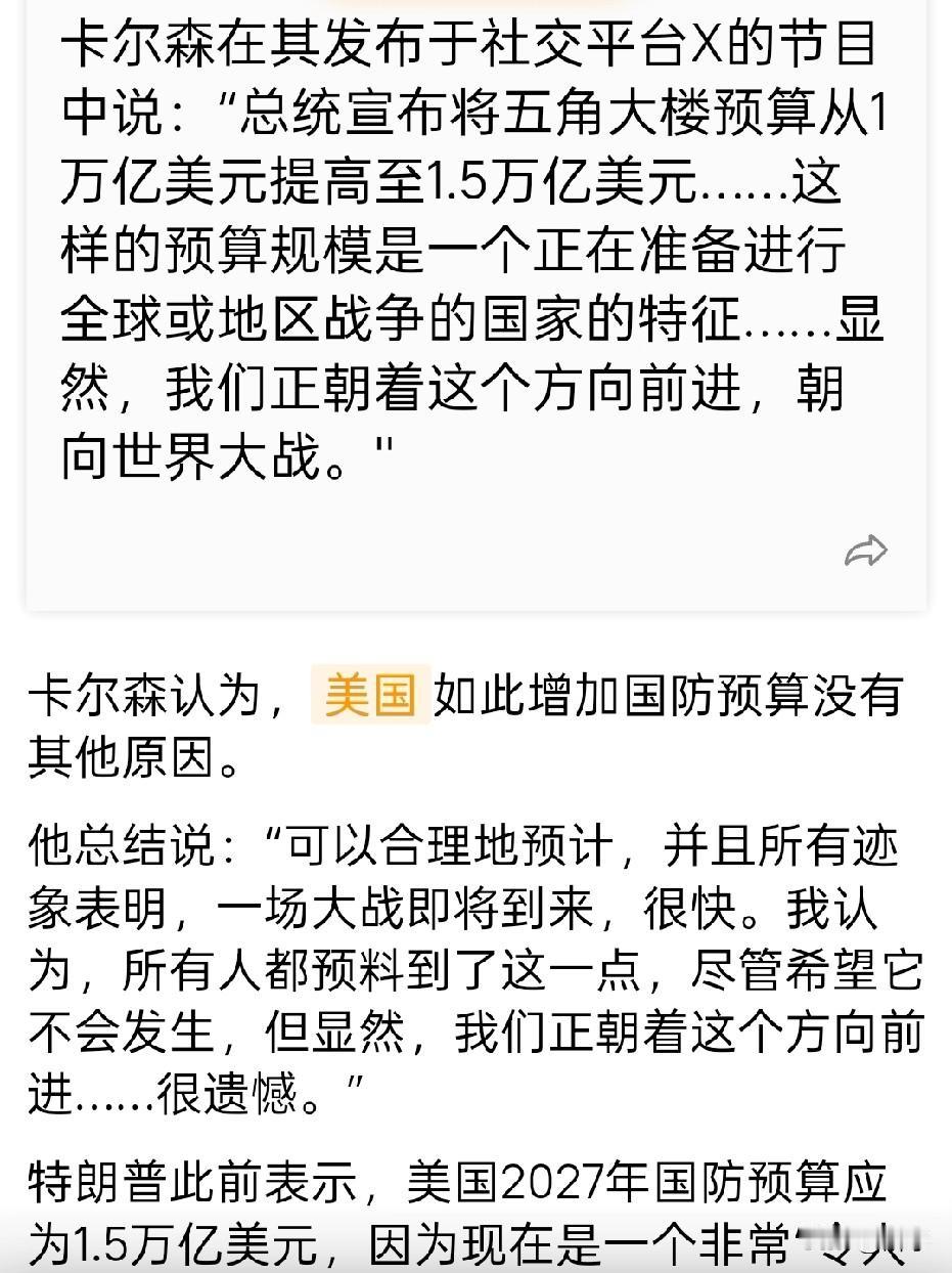 美国记者推测特朗普在准备世界大战! 美国著名记者卡尔森在评论特朗普将美国2027年军费预算从1万亿美元提高至1.5万亿美元时推测认为,特朗普正在准备世界大战(具体内容见图二)。作为一个美国媒体界经常接触包括特朗普在内的美国政府高层的著名国际记者,或许他真的从特朗普他们那里获得了特朗普政府的打算,那就是在准备一场空前规模的战争,这就可以解释得通最近特朗普又是要霸占委内瑞拉石油,又是要强占格陵兰岛,原来他们的目的就是预先控制能源和战略要地啊,由此可见,特朗普口中高喊世界和平是多么虚伪,这只不过是他的障眼法而己,警惕啊,世界各国!