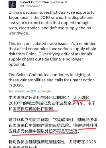 在中方反制日本之后,美国终于出来表态了! 1月8日,美中战略竞争特别委员会表示,中国限制对日两用物项出口的决定,让人联想到2010年的稀土争端,以及去年那场波及全球汽车、电子和国防供应链的出口限制举措,该委员会表示,这绝非孤立的贸易问题,而是警示盟国经济体正面临源自中国的严重供应链风险。 实事求是讲,这种姿态恰恰说明,中方的反制动作已经精准触及了美日同盟的痛处。 美国之所以反应如此激烈,根本不是为了替盟友寻求公道,而是恐惧日本在巨大的断供压力下产生动摇。 说难听点,美国现在最担心的不是全球供应链的稳定性,而是其精心编织的对华封锁网,会因为日本这个关键节点的松动而彻底崩溃。 现在的形势与2010年有着本质的区别。当年的博弈更多依赖原材料的规模,而现在的中方手中握着的是全产业链的精炼技术和精密组件的定义权。 表面上是石墨和光学材料的买卖,实际上是半导体和新能源产业的心脏跳动权。 说白了,这就好比美国在指挥日本去组装一台最先进的精密仪器,日本手里有外壳和图纸,但核心的润滑剂和精密透镜却只有中国能提供。 如果日本因为拿不到这些关键材料而导致产业停摆,其国内财团必然会向政府施压,进而可能在对华出口管制上“放水”甚至反水。 问题在于,美国现在除了口头声援,根本拿不出实质性的方案来帮日本解决原材料短缺。 美国口声声说要帮盟友建立“韧性供应链”,但到了需要真金白银投入或者分享资源的时候,动作却比谁都慢。 这次美方的表态,本质上是给日本打一种“政治补药”,要求日本即便面临产业割肉的痛苦,也要继续跟着美国的步调死磕到底。 这种“要求盟友承担代价、自己享受安全”的做法,正在让美日同盟内部产生微妙的裂痕。 日本企业界非常清楚,脱离了中国的原材料支撑,所谓的“半导体复兴”不过是一场幻梦。美媒渲染的“供应链风险”,其实是其失去对全球资源绝对调配权后的极度焦虑。 实事求是讲,这次反制向世界传递了一个道理:中国不主动惹事,但也绝不怕事。 如果有人想利用高端技术封锁中国,就必须做好失去基础材料和关键组件支撑的心理准备。这种精准打击对方产业链软肋的策略,正在实现“以战促谈”的效果。 有一说一,美方的这次表态更像是一次“防御性恐吓”。 它越是强调风险,就说明其在这一领域的有效筹码越少。日本能否在美方的“捧杀”与现实的断供压力之间找回独立自主的理性,将直接决定其未来十年的产业国运。 以上是小编个人看法,如果您也认同,麻烦点赞支持!有更好的见解也欢迎在评论区留言,方便大家一同探讨。