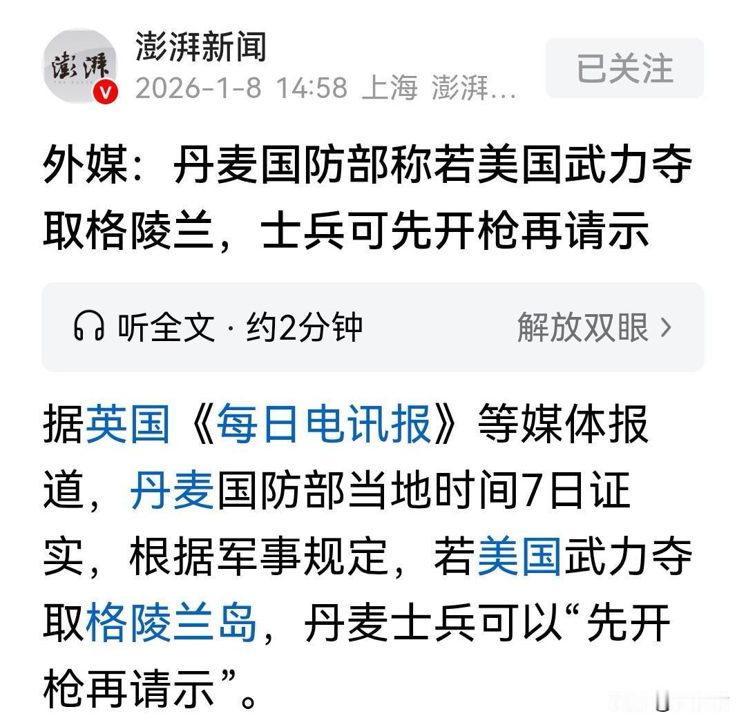 北约要崩?丹麦硬刚美国:敢抢格陵兰岛,士兵先开枪再请示! 据英国《每日电讯报》爆料,当地时间1月7日丹麦国防部重磅证实:如果美国敢武力夺取格陵兰岛,丹麦士兵有权“先开枪再请示”,不用等上级指令就能直接反击!一边是号称“盟友”的北约老大,一边是向来温和的北欧小国,居然闹到差点“刀剑相向”的地步,这背后的博弈远比我们想象中更劲爆! 这事儿可不是突然爆发的,而是美国对格陵兰岛跨越百年的“觊觎”终于逼得丹麦破防了!早在1867年,美国就想从丹麦手里买下雪域广袤的格陵兰岛,1946年甚至开出1亿美元黄金+阿拉斯加油田开采权的天价,结果两次都被丹麦硬气拒绝。可特朗普政府上台后,这份野心直接摆上了台面,尤其是2025年重返白宫后,更是步步紧逼:任命“格陵兰岛特使”专门推进夺岛计划,把岛屿军事管辖从欧洲司令部划给北方司令部,最近更是直白放话“总统保留所有选项”,明晃晃把“武力夺取”算进了可行方案里。 而美国之所以对这座岛如此执着,根本原因就是它的价值实在太惊人了!作为全球最大的岛屿,格陵兰岛藏着两大“王牌”:一是地缘战略地位,它坐落在北极核心区,扼守着格陵兰-冰岛-英国的GIUK缺口,是北冰洋和大西洋连通的咽喉要道,随着北极冰川融化,这里的航道能大幅缩短亚欧美之间的运输距离,不管是军事监控还是商业航运,都是无可替代的关键节点;二是矿产资源宝库,岛上已探明150万吨稀土储量,还有175亿桶石油、4.15万亿立方米天然气,这些都是制造导弹、半导体、新能源设备的核心原料,对掌控全球供应链至关重要。更别提美国早就在这里建有皮图菲克太空基地,能监测俄罗斯弹道导弹动态,是北美防空系统的关键支点,这么一块“宝地”,美国自然馋到不行。 但丹麦这次是真的被逼到了墙角,直接亮出了压箱底的规则: 1952年制定的军事规定至今仍然有效,明确写着“遭遇入侵时,被攻击部队必须立即投入战斗,无需等待命令”!紧接着丹麦首相弗雷泽里克森更是放出狠话:“如果美国对北约盟友动武,一切都将终结”,暗指北约同盟体系会彻底崩塌。更关键的是,法国、德国、英国等6个欧洲国家立刻站队,发布联合声明强调“只有丹麦和格陵兰岛民众能决定自身事务”,显然大家都看清了:今天美国能对丹麦的岛屿动歪心思,明天就可能轮到其他国家。 问题是,丹麦军力远不如美国,真的敢开枪吗?其实这背后是丹麦的清醒博弈:一方面,北约的“集体防御”原则摆在那,美国要是对盟友动武,就等于亲手摧毁自己主导的联盟体系,届时会陷入空前孤立;另一方面,格陵兰岛5.7万居民中超过80%都反对美国介入,深厚的民意基础让丹麦有了硬刚的底气。丹麦的“先开枪再请示”,更像是一种底线宣言:“我知道打不过,但你敢越界,我就敢反击,绝不任人拿捏”。 这事儿发生在美军刚干预委内瑞拉之后没多久!前脚刚用武力控制另一个主权国家,后脚就把矛头对准盟友的领地,美国这种“顺我者昌逆我者亡”的霸权逻辑,正在让越来越多国家警惕。俄罗斯外交部发言人扎哈罗娃直接嘲讽:“美国总想着把别人的土地据为己有”,欧盟也明确表态支持丹麦维护领土完整,就连美国国内都有不少批评声音,认为这种做法是对国际法的公然践踏。 现在局势已经有了微妙变化:美国国务卿鲁比奥透露下周会和丹麦协商,白宫声明也收敛了武力威胁的语气,转而说要“探讨合作方案”。但这场风波留下的裂痕已经难以弥补!曾经被认为“铁板一块”的美欧同盟,早就不是想象中那么紧密了。丹麦的硬刚,本质上是小国在霸权面前的自保,更是对“国家主权平等”原则的坚守:不管国家大小,领土和主权都不该被随意侵犯,这才是国际秩序的底线。