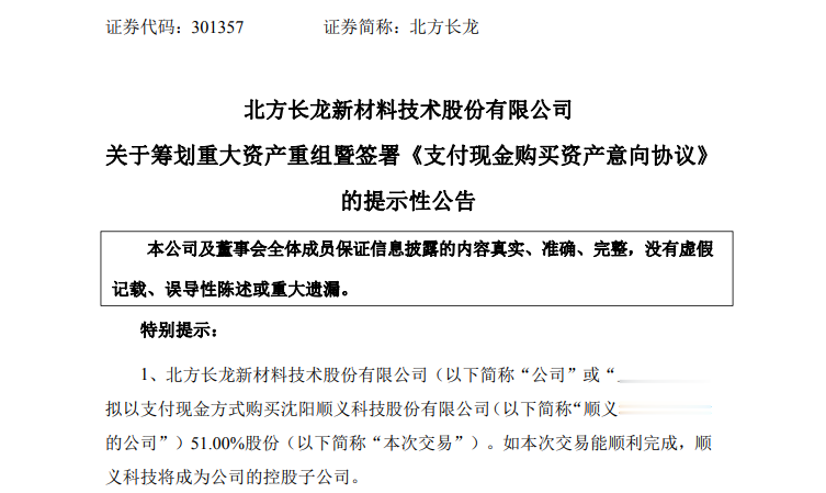 1月8日晚间,北方长龙(301357)发布公告称,拟以支付现金方式购买沈阳顺义科技股份有限公司(以下简称“顺义科技”)51%股份,如交易顺利完成,顺义科技将成为公司的控股子公司。本次交易预计构成重大资产重组,不会导致公司控股股东和实际控制人发生变更。筹划本次收购事项,公司股票不停牌。