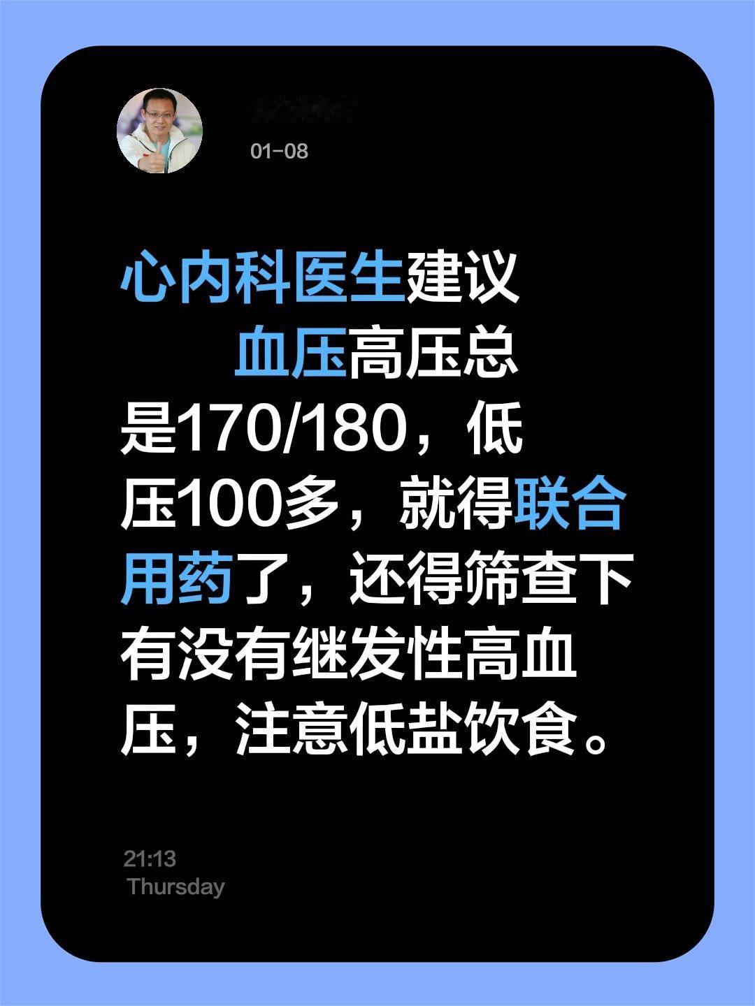 血压高压总是170/180,低压100多,就得联合用药了,还得筛查下有没有继发性高血压,注意低盐饮食。