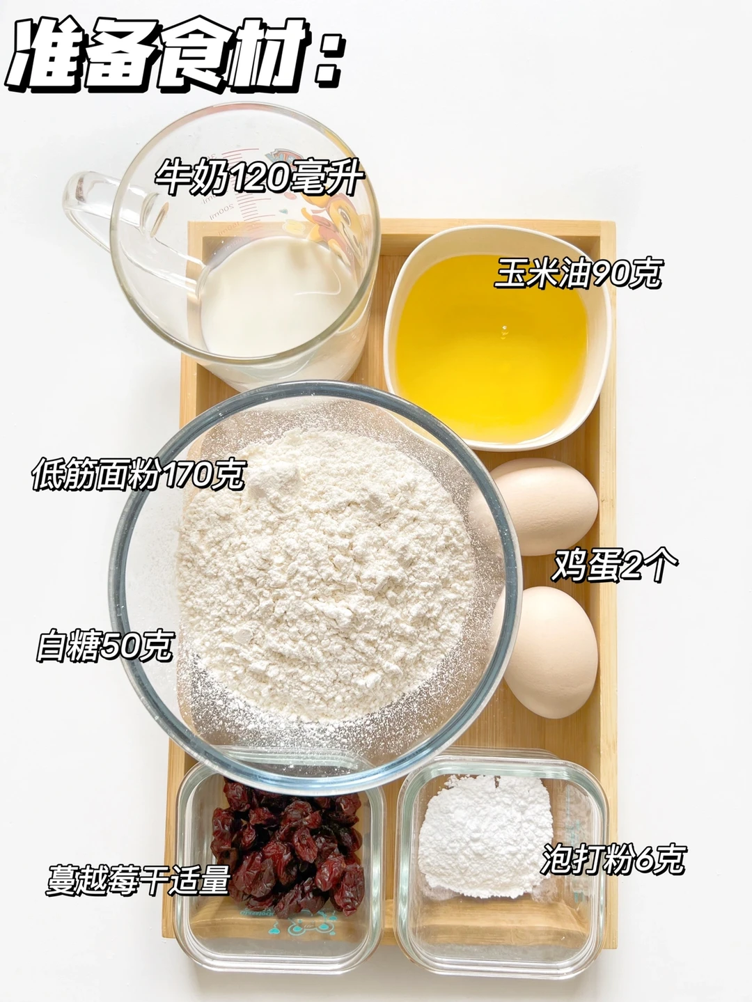 这个蛋糕真的是只要有材料都会成功,不用打发,很适合新手哦,而且松软好吃,我女儿超喜欢吃,姐妹们赶紧试试~ 准备食材👩🏻🍳: 鸡蛋2个 白糖50克 牛奶120毫升 玉米油90克 低筋面粉170克 泡打粉6克 蔓越莓干适量 制作过程👩🏻🍳 1、鸡蛋+砂糖+牛奶+玉米油,搅拌均匀 2、过筛低粉+泡打粉搅匀,放蔓越莓干拌匀 3、蛋糕糊倒入纸杯模具 8分满,表面撒蔓越莓干,送入预热好的烤箱,175度30分钟,最后5分钟观察上色哈,因为烤箱脾气不同,大家也可以根据自己喜欢放干果哦