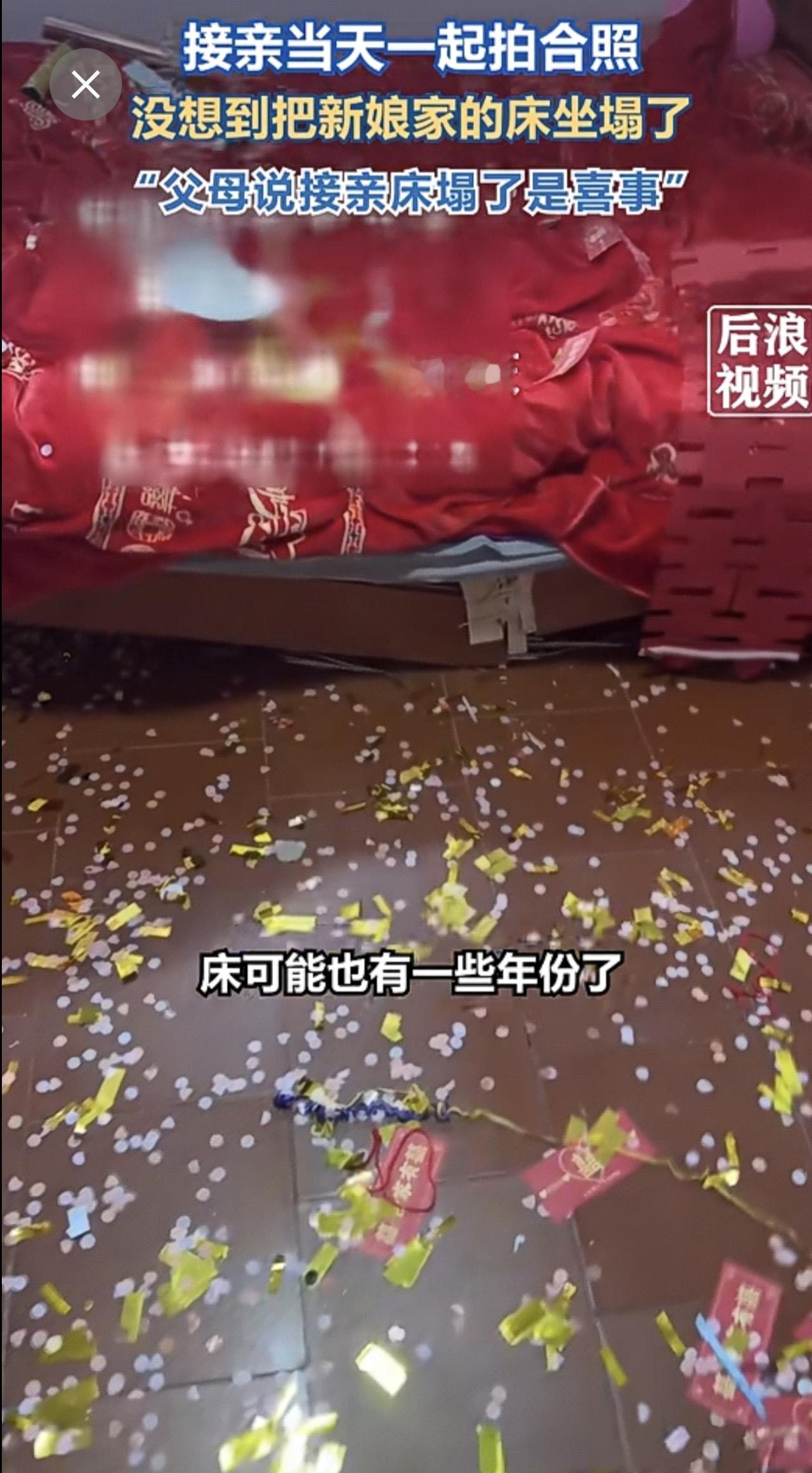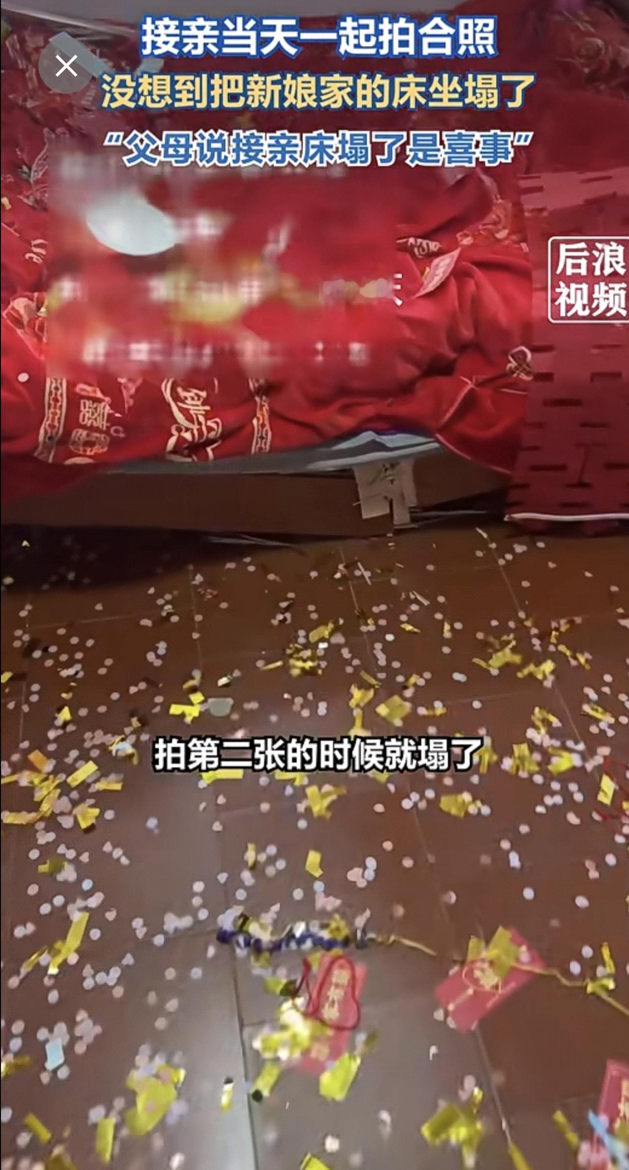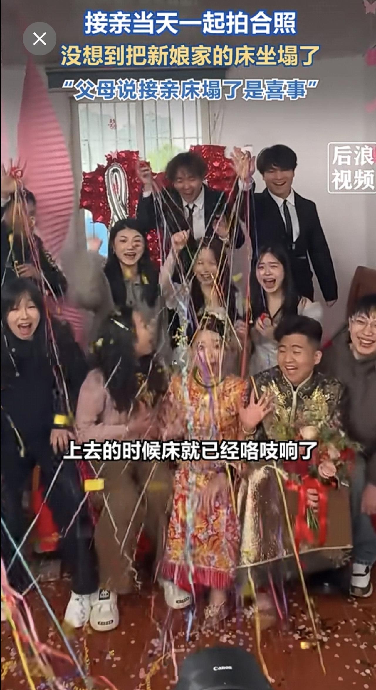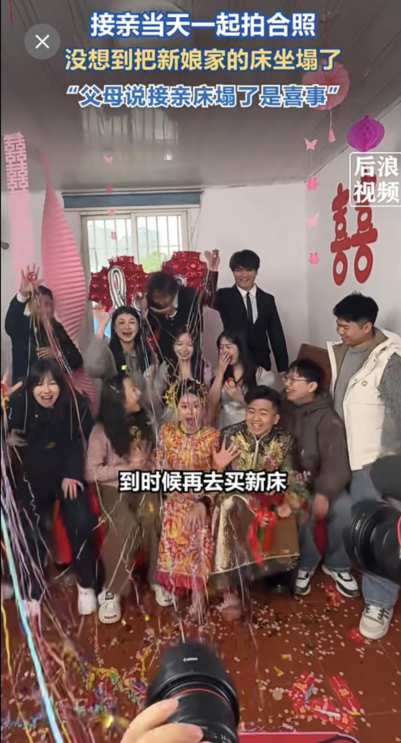 接亲合影瞬间新娘家床被坐塌了 1月6日,福建莆田。新人结婚当天和朋友一起合照,摄影师按下快门瞬间新娘家床被坐塌了。