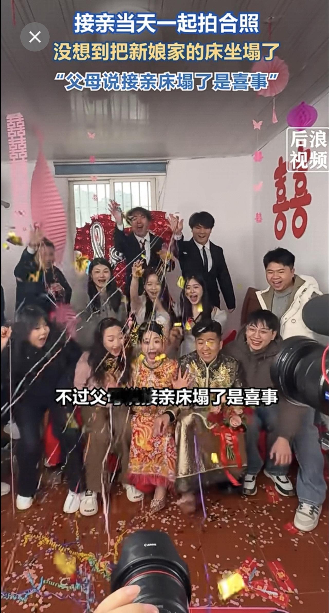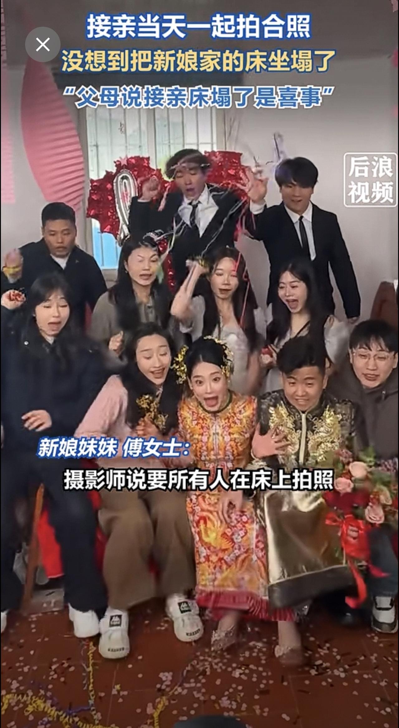 接亲合影瞬间新娘家床被坐塌了1月6日,福建莆田。新人结婚当天和朋友一起合照,摄