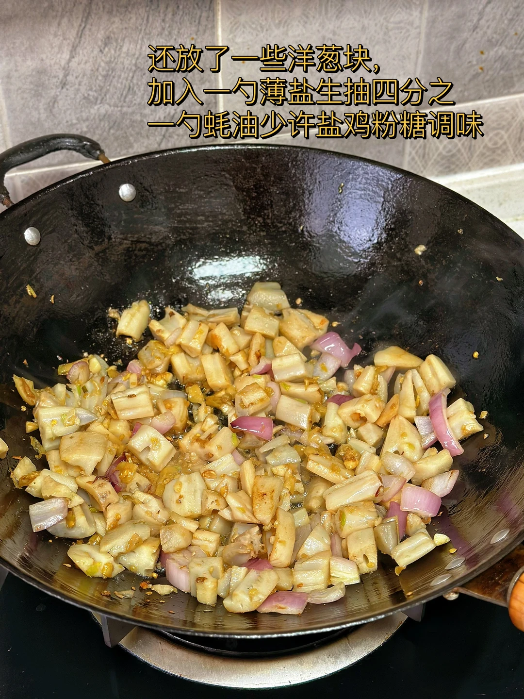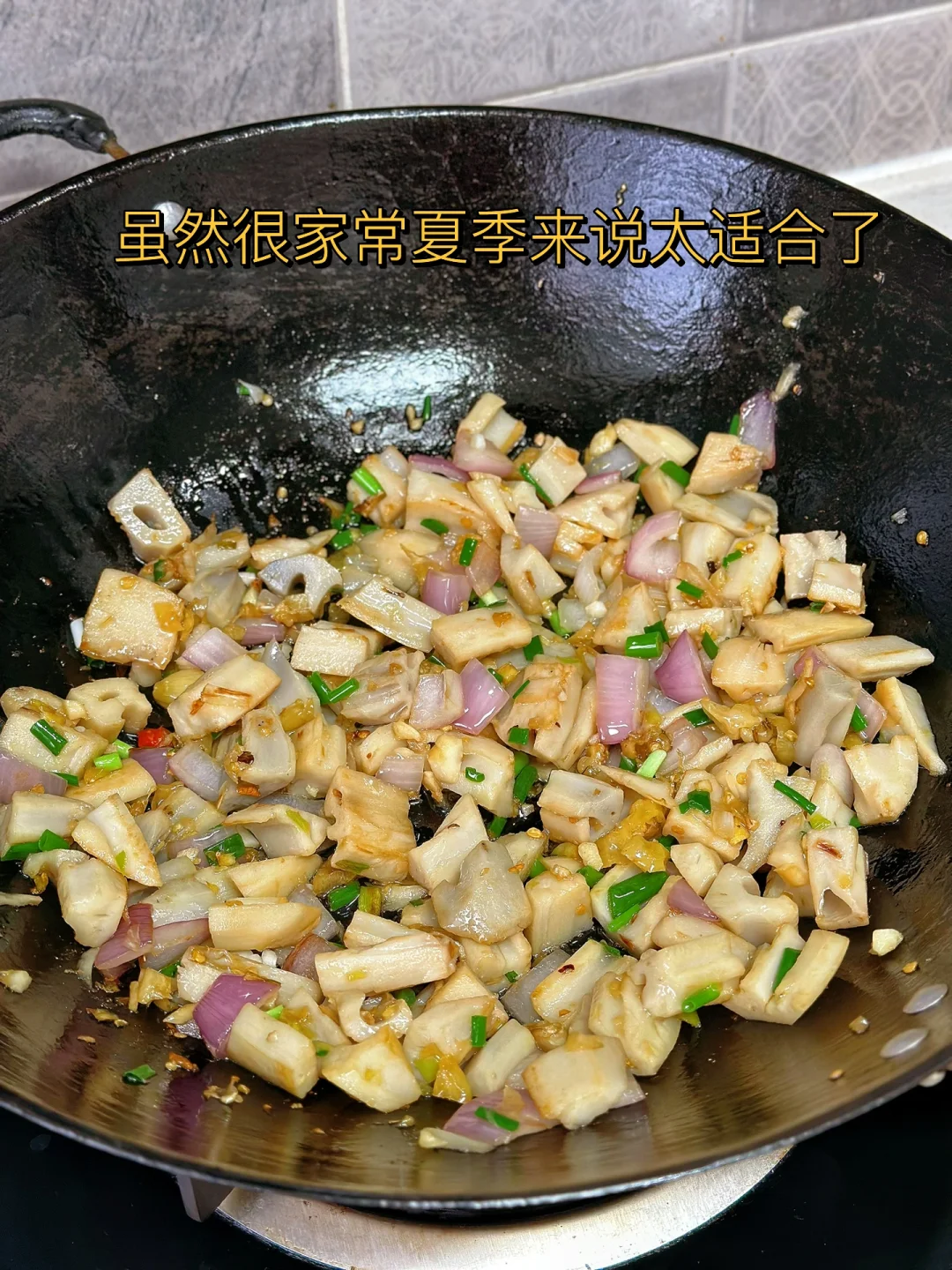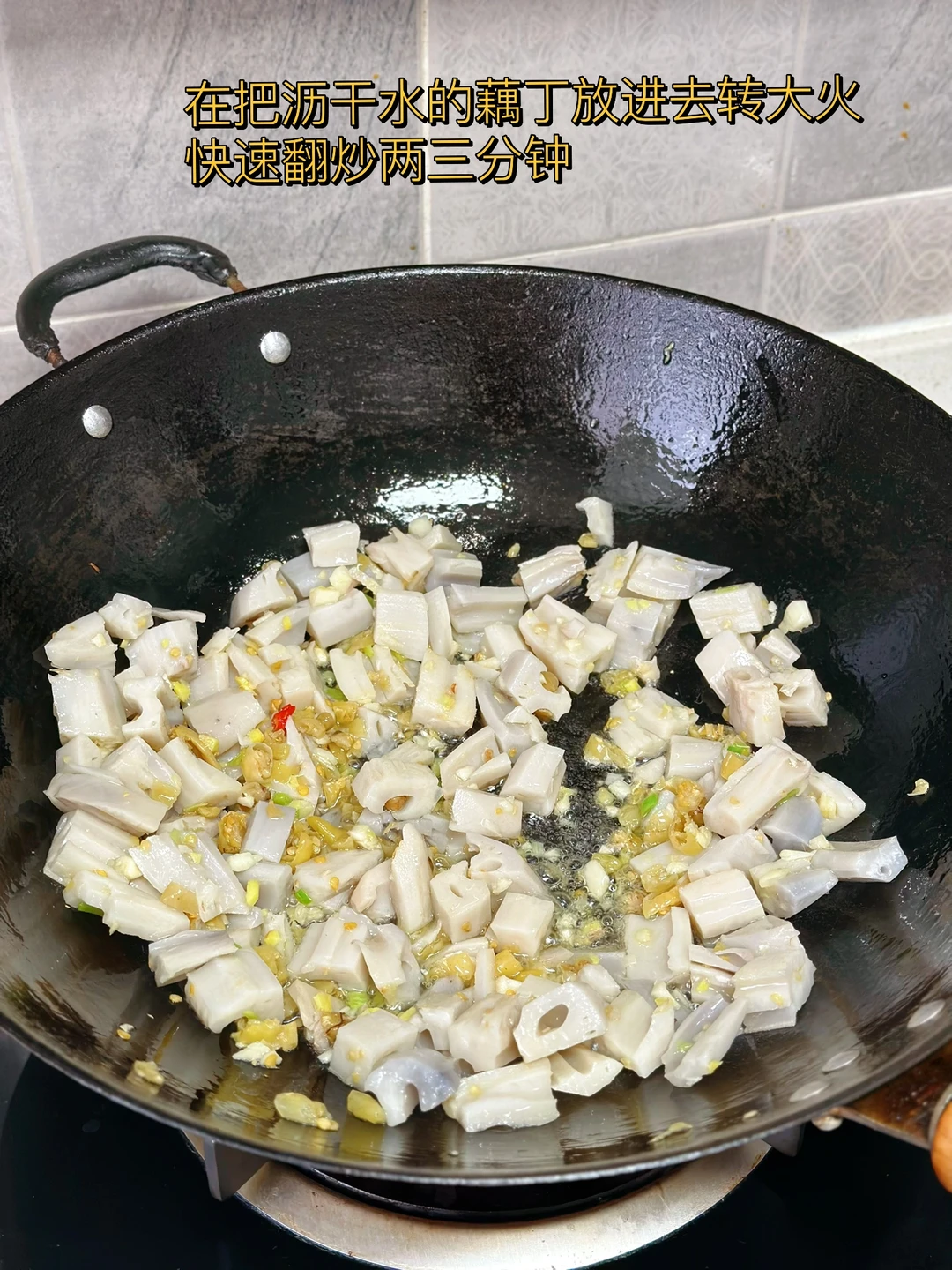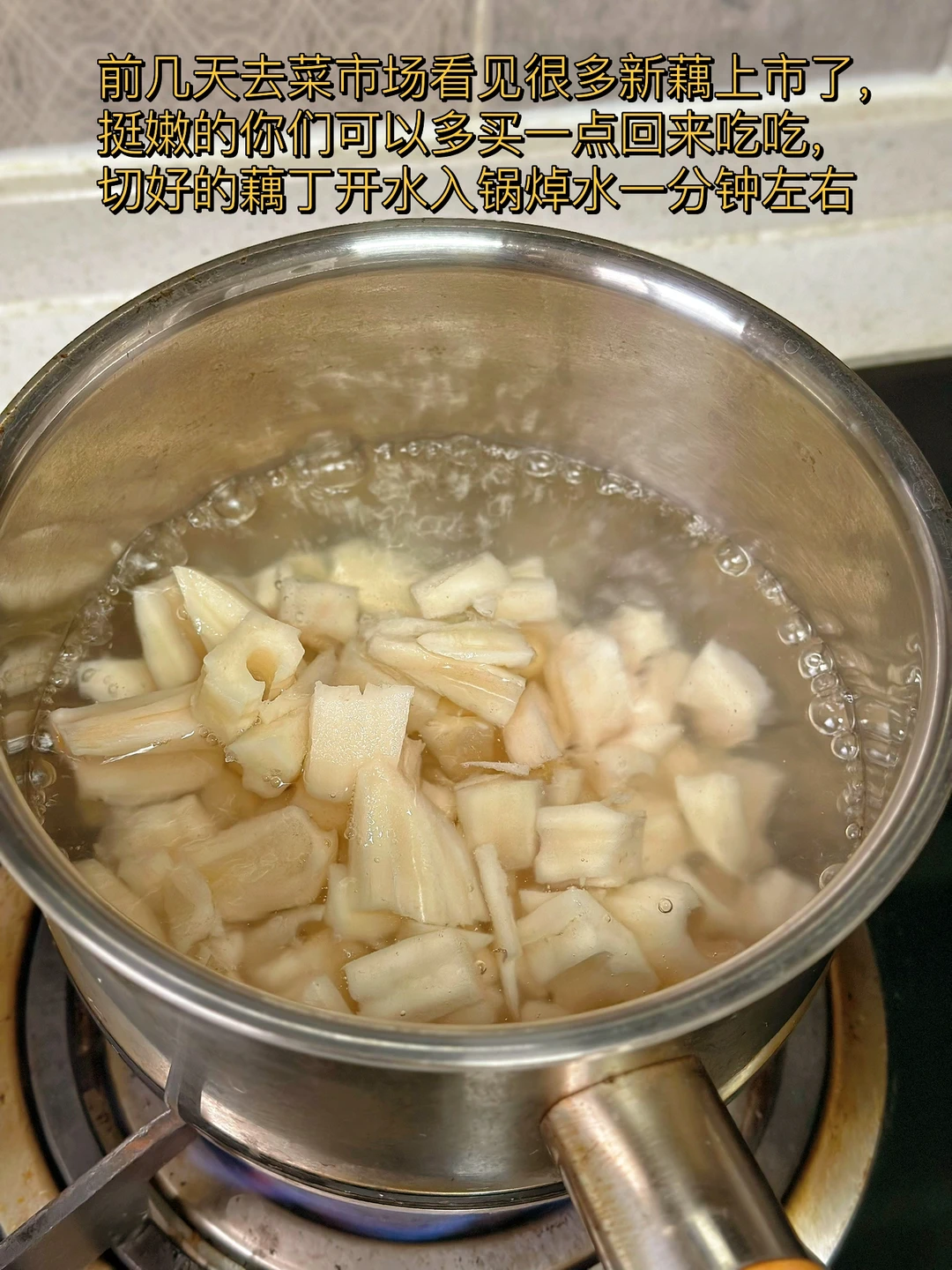 1. 前几天去菜市场看见很多新藕上市了,挺嫩的你们可以多买一点回来吃吃,切好的藕丁开水入锅焯水一分钟左右 2. 泡椒和小米辣切碎待用 3. 大蒜生姜葱白段切小碎待用,小火爆香大蒜生姜小米辣泡椒碎 4. 在把沥干水的藕丁放进去转大火快速翻炒两三分钟 5. 还放了一些洋葱块,加入一勺薄盐生抽四分之一勺蚝油少许盐鸡粉糖调味 6. 出锅前放入多一点的葱花段翻炒匀即可,虽然很家常夏季来说太适合了