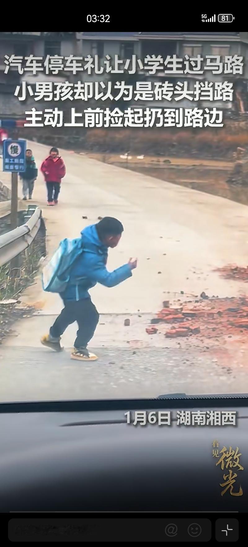 ✨湖南湘西街头,司机停车礼让小学生过马路,小男孩却以为是砖头挡路,主动上前捡起扔到路边 司机的一脚刹车是尊重, 男孩的一次弯腰是纯粹, 两份互不知晓的善意撞个满怀,让平凡的街头瞬间有了温度。 这样的小误会,麻烦多来几打!