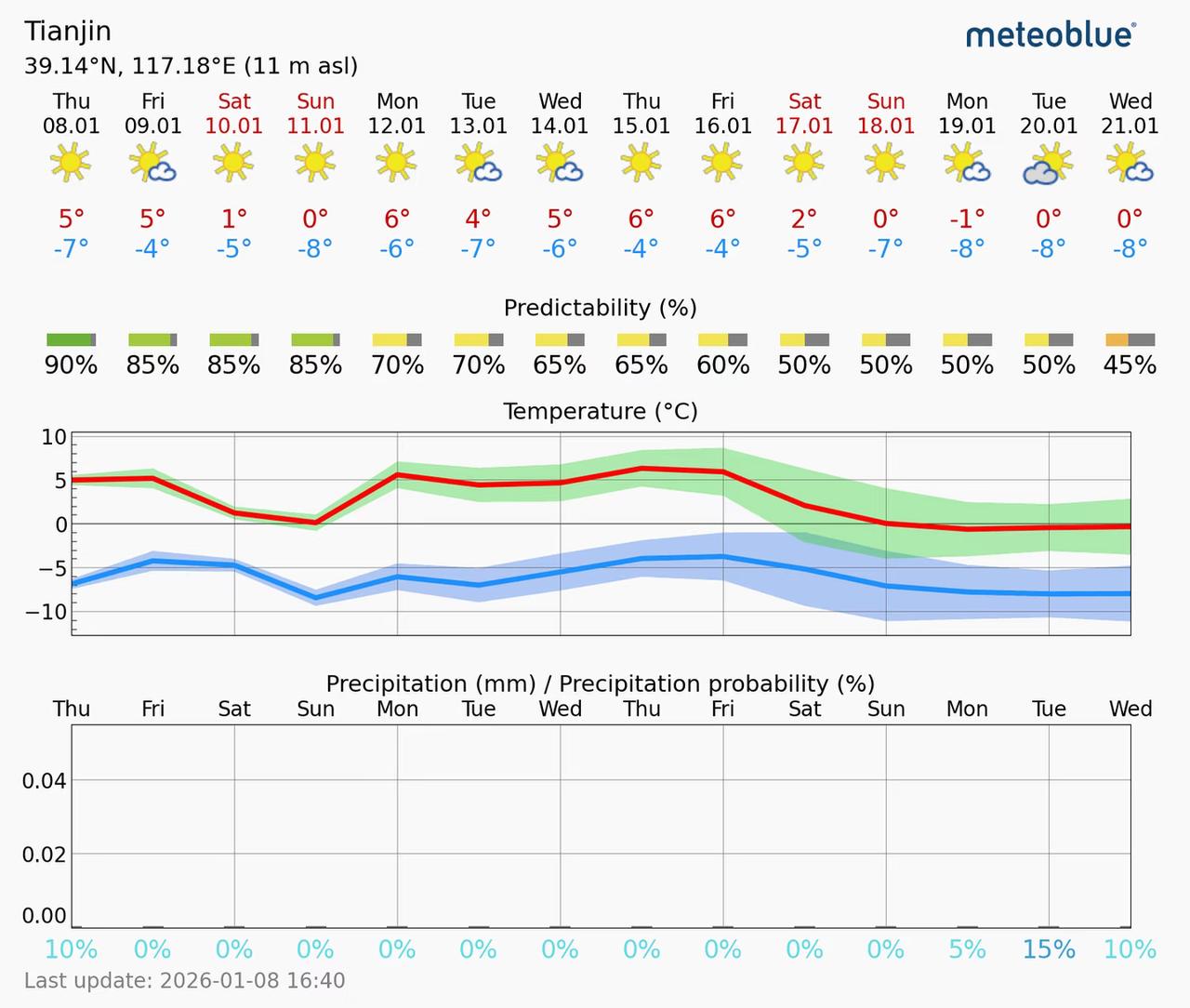 1.8-20:00 天气预警:北京市和石家庄市大风蓝色预警中,天津市大风黄色预警中。 未来三天:北京北部西部山区明天下午小概率会飘点儿雪花(见图二),北京城区、石家庄市区、天津市区有雪的可能性很小。 风力状况:北京明天傍晚到周六夜间西北风很大,周日下午偏南风明显。石家庄明天早上到周六夜间偏西风转西北风很大,周日白天偏南风明显。天津明天傍晚到周六夜间西北风很大,周日下午偏南风明显。 图一为彩云天气模拟的明天14点京津冀风力状况图,图三到图五分别为北京城区、石家庄市区、天津市区未来14天大致的天气状况。 PS:京津冀明天开始的这场风看起来比较猛,大家出行注意安全。
