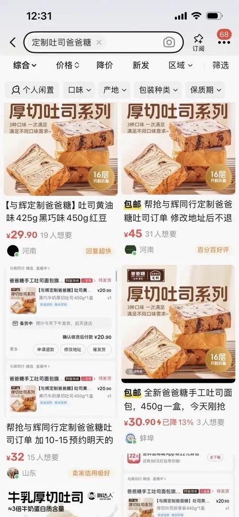 订制吐司如此被消费者喜欢? 有专业黄牛蹲守与辉同行直播间抢吐司, 然后转手去二手平台高价转卖。 难怪现在直播间每天都上几万单, 很多人还是抢不到。 咱们这些业余怎么抢得过专业的? 其实我也无法理解, 是哪些朋友会去二手平台买高价吐司? 与辉同行现在天天有, “爸爸糖”官方旗舰店每天也有卖的, 至于花高价去买吗? 你们能确定买到的就是正品吗? 如果买回去有什么不满意, 如何售后呢? 虽然一单吐司也就二十来块钱, 但是万一你不喜欢呢? 怎么办? 与辉同行定制吐司的初衷是让消费者吃到健康放心的食品, 单量上尽量的满足大家。 没想到被一些有心之人利用, 高价倒卖谋利。 也有人怀疑真的会有人去买吗? 肯定有, 存在即合理。 如果没有人买他们不会去抢, 也不会挂链接上去。 有需求就会有市场。 我也在想, 如果真的没人买, 那他们抢到的吐司会如何处理? 在没发货之前退货? 还是到手后再退? 很大可能他们挂的链接其实是在“预售”, 有人下单他们才会去抢, 抢到后直接修改收货地址, 只有这样他们才可以不花成本毫无风险的赚钱。 就是抢一单面包赚几块钱。[大笑][大笑] 哎,没办法, 这事宇辉也知道, 他也感觉头疼吧。 为了这吐司, 他没少挨“骂”。 直播间已经限购了, 但是这样的事情真的很难杜绝。 接下来吐司会晚上上链接, 还增加了预售。 还会有别的品牌定制吐司上架, 相信以后定制吐司不会这样“哄抢”了。 开始我抢吐司的时候小丫头非常不屑, 她说一群疯子, 不就是吐司吗? 至于吗? 直到巧克力味吐司回来以后, 她一吃一个不吱声。 每天早上我用空气炸锅两面分别打上两三分钟, 再给她热一杯牛奶, 上学路上边走边吃, 早餐就解决了。 还剩下一箱黄油的, 她说给她留着。 看来这又是一个被“产品”折服的孩子。 也许这就是定制产品受欢迎的原因吧。 里面少了一些高科技, 入口那一瞬间也许口感不如“高科技”的好吃, 但是越吃越有味道, 我丫头说的确是不错。 难得有她喜欢的面包吐司。 散会! 董宇辉