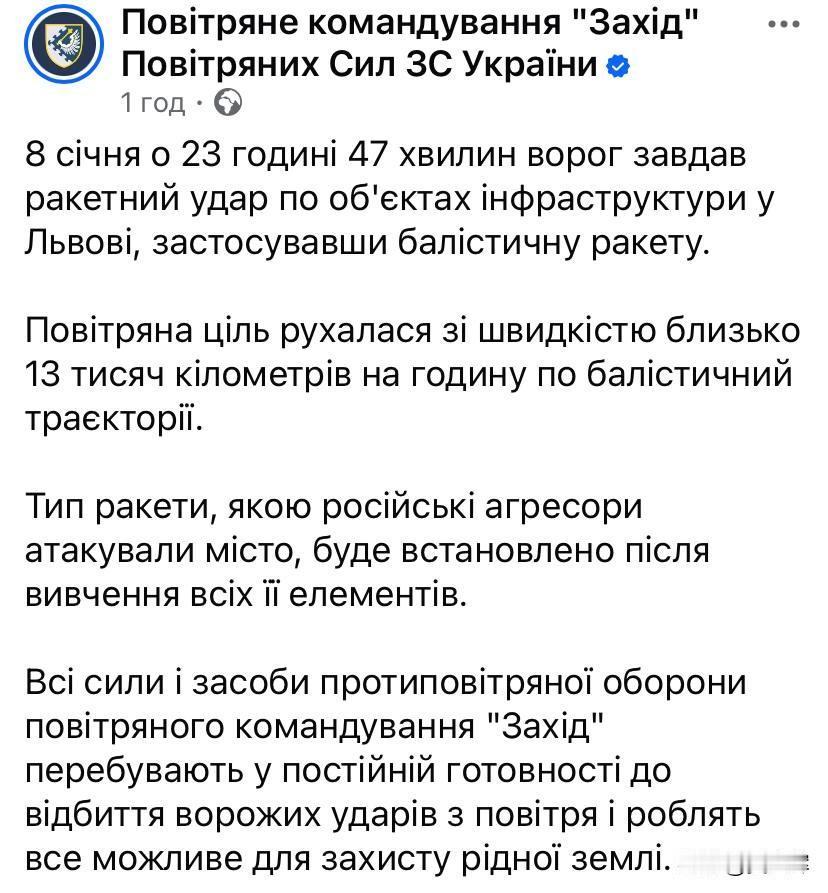 【等于官宣:俄军动用“榛树”弹道导弹袭击利沃夫基础设施】 乌克兰西部空军司令部通报,“1月8日23时47分,俄军发射一枚弹道导弹,对利沃夫境内基础设施目标实施打击。该导弹沿弹道轨迹飞行,速度约达13000千米/小时。俄军此次袭击所用导弹的具体型号,需在完成对导弹残骸的全面勘验后才能确定。” 给出的导弹速度为13000千米/小时,这等于乌克兰官宣俄军使用了“榛树”。