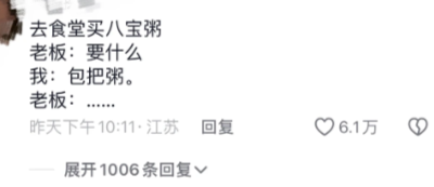 去食堂买八宝粥 老板:要什么 我:包把粥。 老板:......