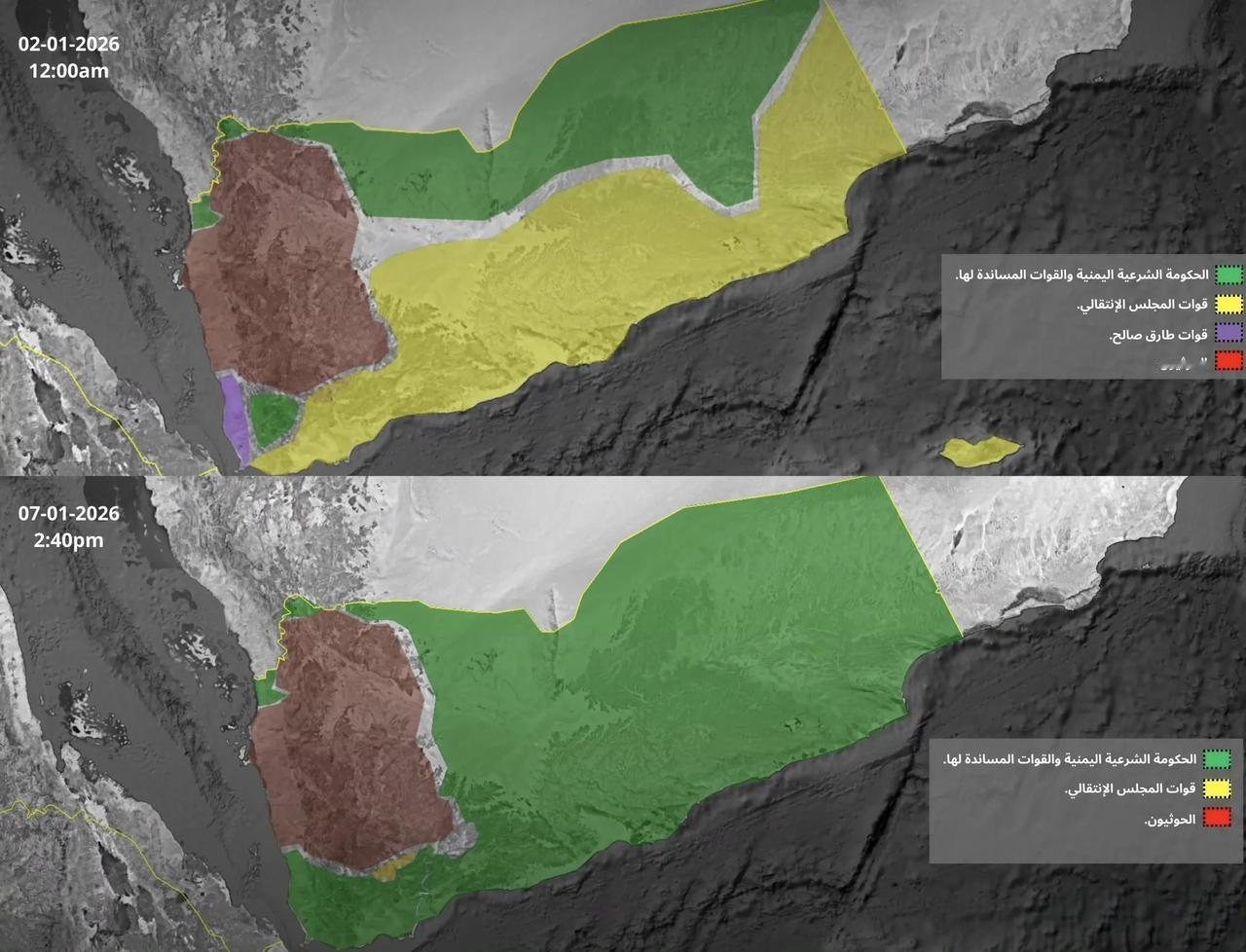 不到一周,阿联酋支持的也门南方过渡委员会(STC)就土崩瓦解(黄色区域),地盘完全被沙特支持的也门政府(绿色区域)控制,阿联酋也全面退出也门。原本的“三分也门”变成了“两强对峙”(褐色是胡塞武装控制区)。 也就是说,在沙特与阿联酋争夺也门控制力方面,阿联酋输的连底裤都没了,真的是“其兴也勃焉,其亡也忽焉”。中东这地方就是这么神奇! 胡塞武装的地盘没有变,战略方面看似被也门政府三面包围了。但实际上也门政府控制区域看着面积大,但是好地少、人口仅占也门的三分之一,而胡塞武装控制的地盘尽管只有也门总面积的近三分之一,但是区域内好地多,人口密度大,所以胡塞武装控制的人口占也门总人口的73%左右。 至于双方武装力量的战斗力方面,胡塞武装比也门政府军强太多了。 #也门冲突# #也门最新局势#
