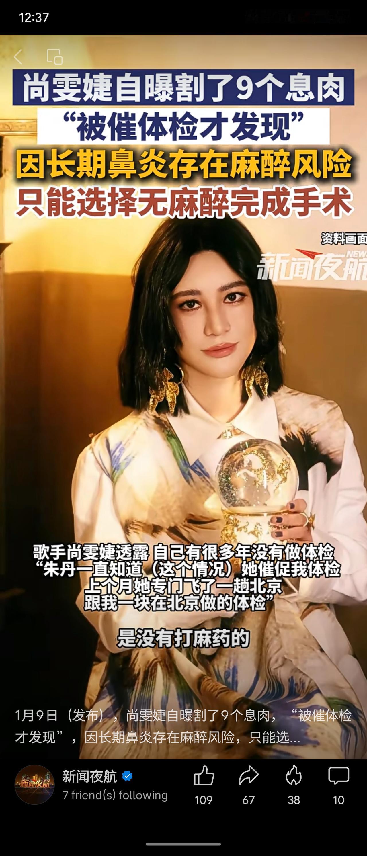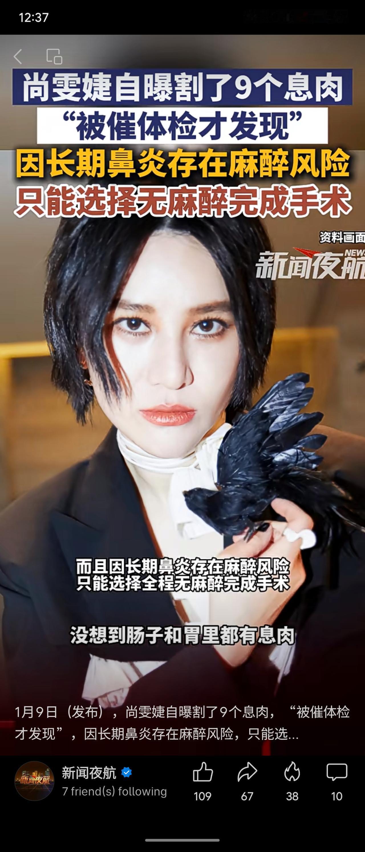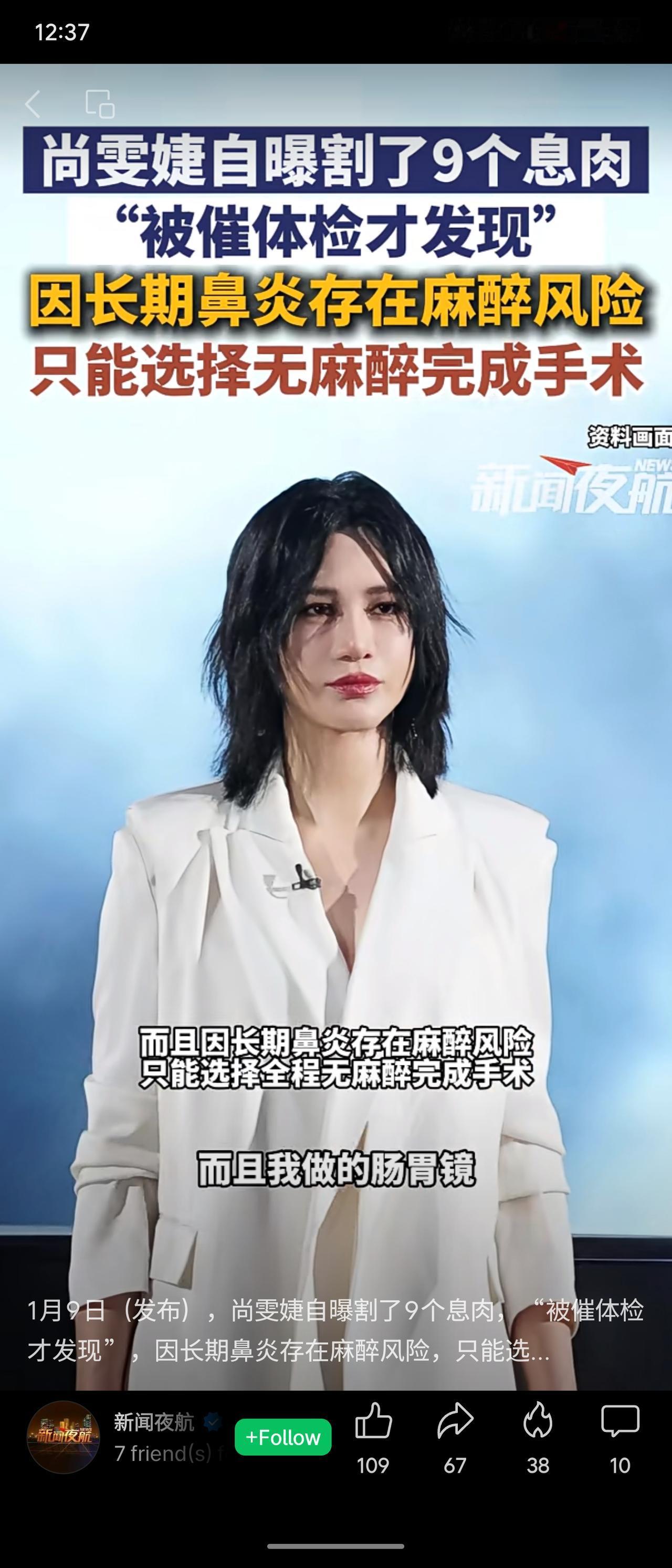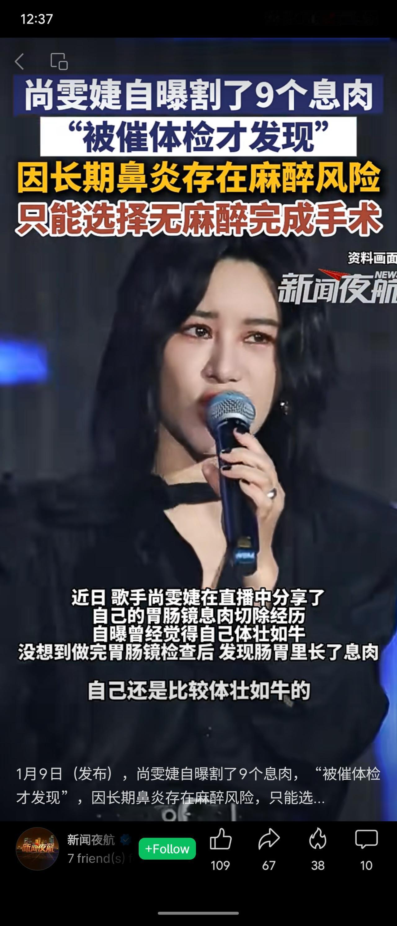 歌手尚雯婕近日透露,在朋友催促下进行体检,发现肠胃内共有9个息肉。因长期鼻炎存在麻醉风险,她选择在无麻醉状态下完成切除手术。她以自身经历提醒公众重视健康,坚持定期体检并保持三餐规律。