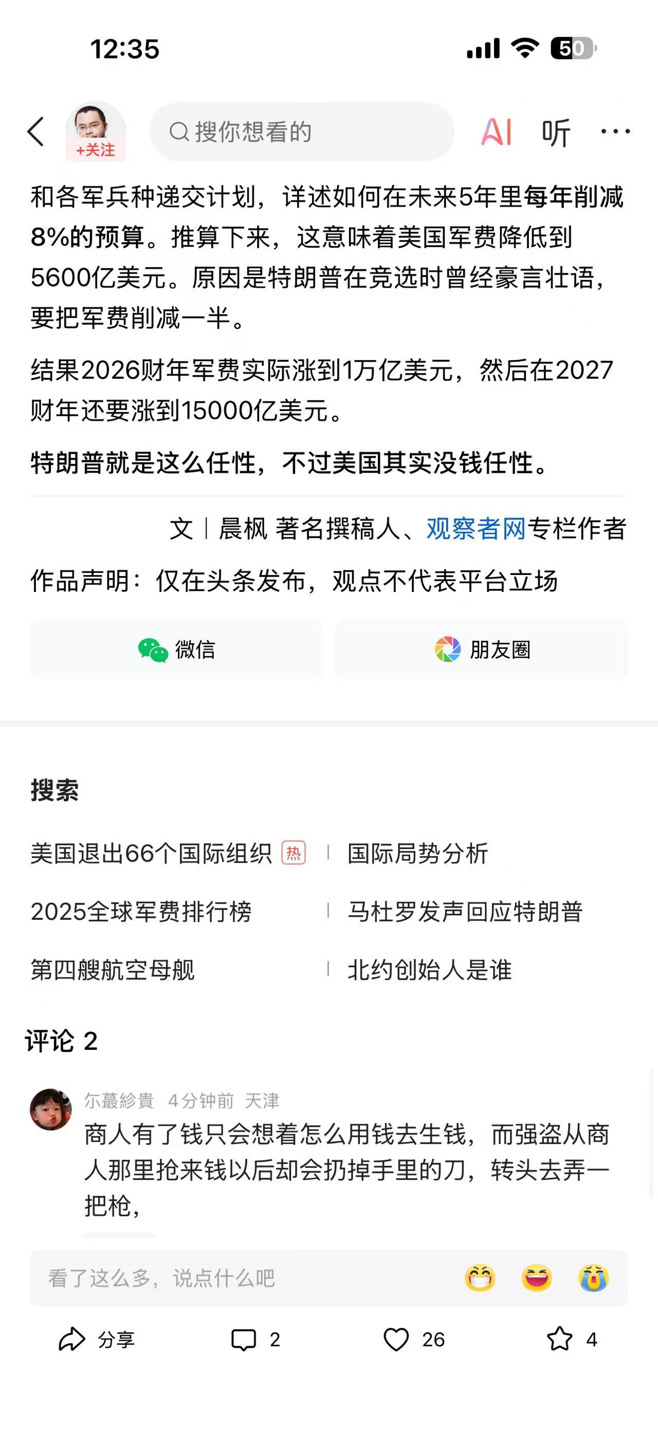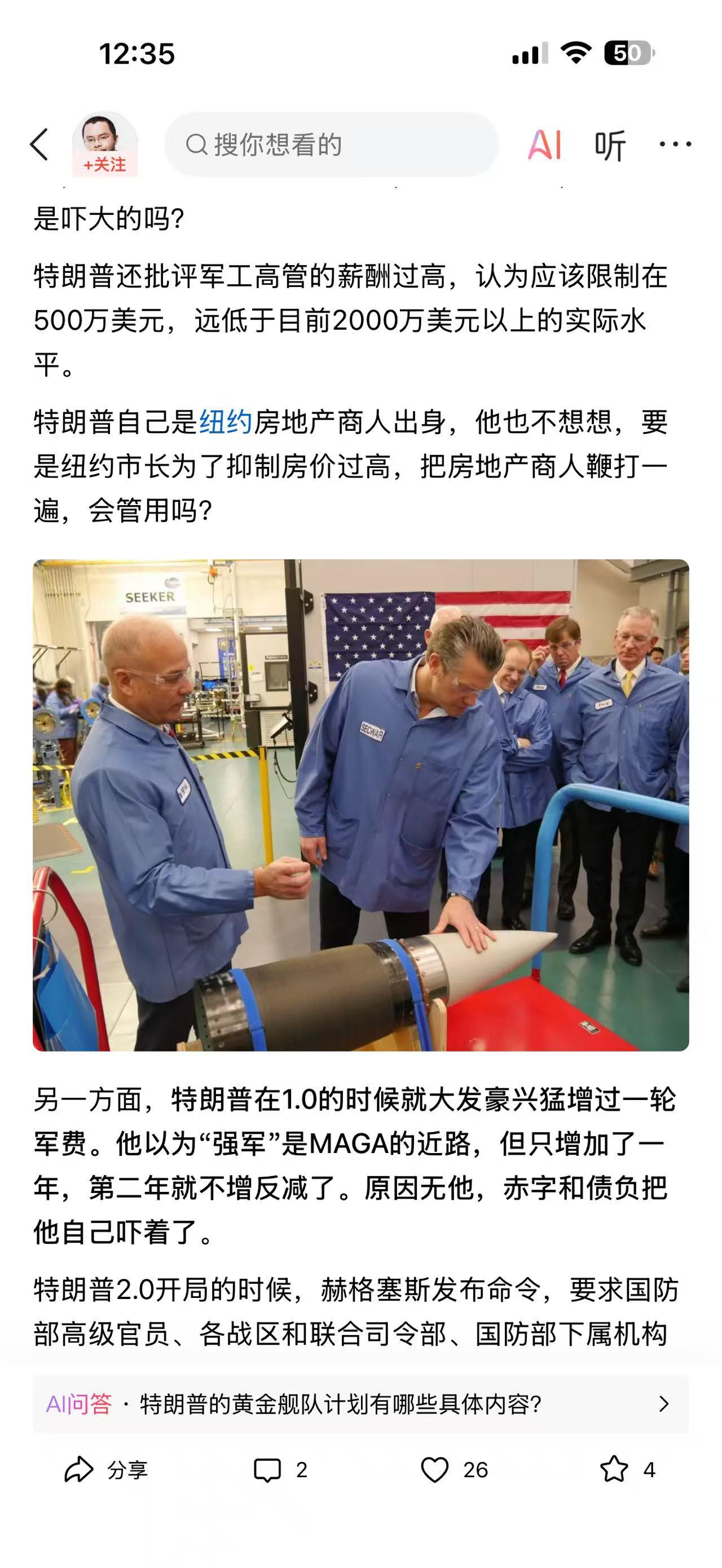 偶然刷到了唐驳虎主笔老师的深度报道后,清晰看透了美国 1.5 万亿美元国防预算背后的矛盾与困境。 从需求端看,美军装备老化严重,B-52、C-130 等老机型超期服役,海军换代计划屡屡受挫,确实需要资金更新;但从供给端看,特朗普寄望的关税收入不仅要填补赤字、发放 “关税红利”,还可能因最高法院判决面临退税,根本无力支撑新增军费。 更棘手的是,军工企业效率低下、成本高企,特朗普的行政命令难改沉疴,这一预算计划注定是 “看起来很美” 的空中楼阁。