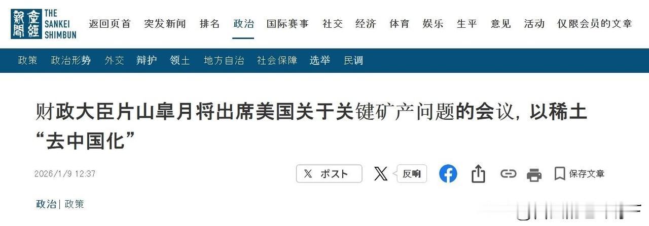 果不其然:高市走投无路后,日本宣布访美,日高官:他们有被中方制裁的经验 果然不出所料,被中方2个公告打懵的日本在走投无路之后,1月9日宣布访问美国,根据日本产经新闻报道:日本财务大臣片山皋月将于1月11号~14号访问美国, 出席关于矿产问题的财政部长会议,她将和G7国家参加,讨论如何构建不依赖中国的稀土供应链。日本财务大臣片山皋月指出:日本有着被中方稀土限制的丰富经验,她希望将日本丰富的经验分享给G7盟友。尽早让全世界实现中国之外的供应链。 评论2句:日本要是提到这一点,绝对是让人无话可说。毕竟全世界现在没有一个国家,像日本一样被中国发起长达135页,1038项制裁,而且还是两次。说好听一点是去开会,实际上则是去找美国求救而已。问题是美国就一头包,现在哪有时间能够帮助日本呢?所以这个苦还得自己受着。