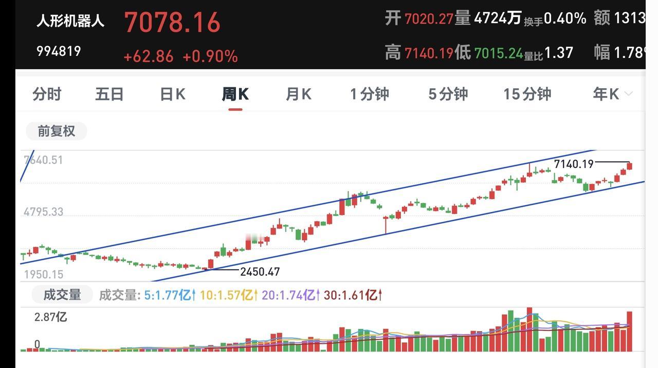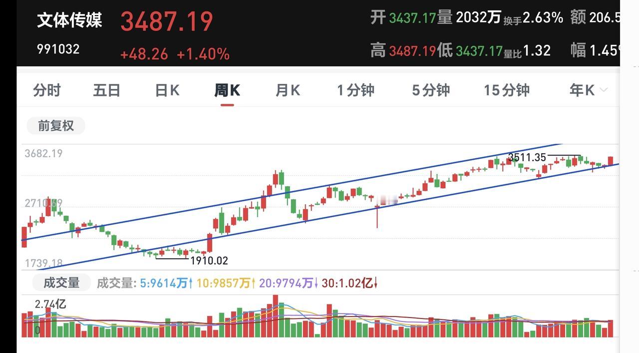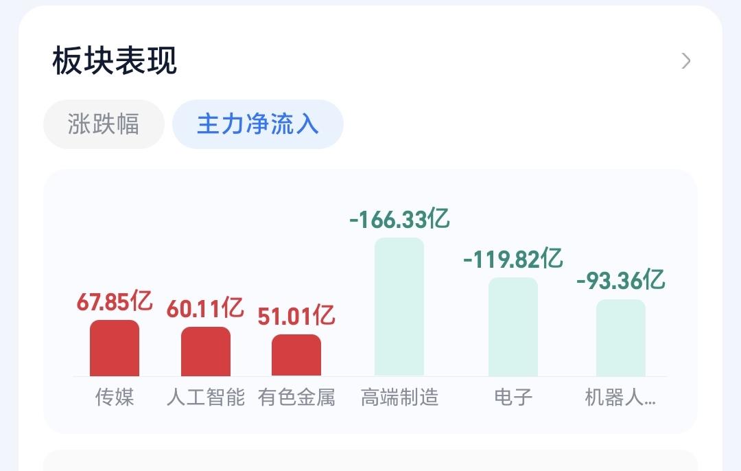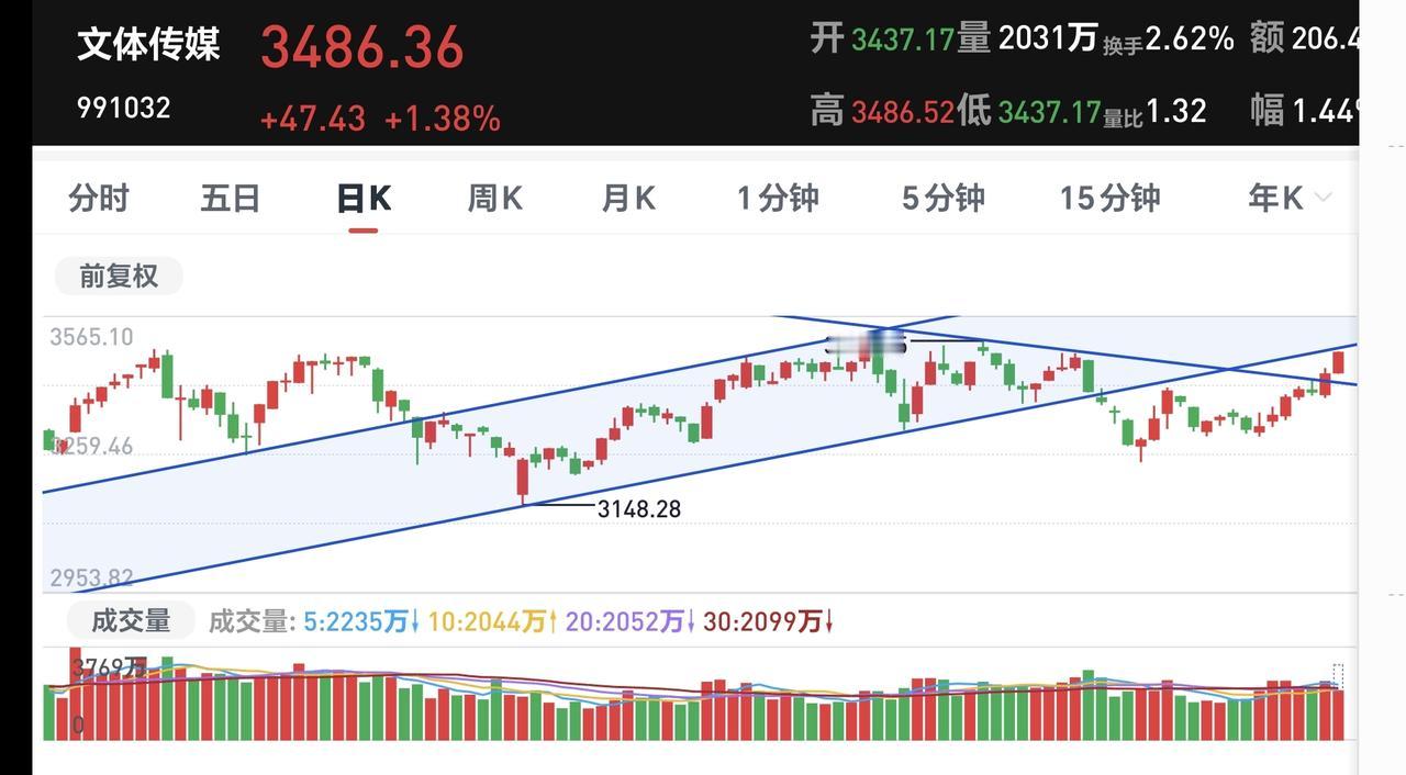 基金:这一轮上涨的高点有可能在什么时候出现 市场下午开盘以后小幅度震荡,指数的涨跌幅度都不大,三大指数都还是保持红盘,创业板指上涨了0.35%,盘中点位3313点,证指数上涨了0.46%,盘中点位4101点,正好打在我给出的压力位置上。 整个股票市场,上涨2510家,下跌2763家,涨停75家,跌停3家,上涨家数少于下跌家数。 持有的基金中,盘中估值上涨幅度最大的三个板块是:医疗板块,先进制造板块,军工板块,估值下跌幅度最大的三个板块是:证券板块,5G板块,海外互联网板块,估值整体上涨了4194元。 整个基金市场,上涨12052家,下跌3261家,上涨幅度超过5%的7家,没有下跌幅度超过5%的基金。 图9是今天基金的上涨排行榜,图10是今天基金的下跌排行榜,图11是ETF上涨幅度排行榜,图12是今天基金的加仓榜,图13是今天基金的减仓榜。 1:现在黄色线与蓝色线纠缠在一起,后面还是要观察这两条线位置会不会有变化,看看黄色线能不能向上拉开与蓝色线的距离,但如果后面上涨的时候,黄色线不能跟上蓝色线,还是需要谨慎的。 2:现在两市累计成交23165亿,相比于昨天同期放量了16%,按照这样的成交量,收盘的时候应该会超过3万亿,3万亿以上的成交量,我们是需要谨慎的,上两次3万亿以上成交量的时候,都形成了高点。 3:现在盘中五天线位置是4075点,现在盘中的点位是4101点,站在五天线之上,后面如果震荡,看能不能站在4075点上方,如果连五天线都没有被跌破,就没有过分害怕的理由。 4:我们来看一下下面的截图14,这是主力资金进出板块的情况,主力资金净流入最多的三个板块是:传媒板块,人工智能板块,有色金属板块,主力资金净流出最多的三个板块是:高端制造板块,电子板块,机器人板块。 5:我们来看一下主力资金净流入最多的传媒板块,看下面的截图15,这是传媒板块日K线图,从图中可以看出,我画了一条倾斜向下的斜线,这是传媒板块日线级别短期下跌趋势线,前几天的上涨突破了这条下跌趋势线,也就是说,传媒板块日线级别短期下跌趋势有可能已经被改变。 我们来看一下下面的截图16,这是传媒板块日K线图,从图中可以看出,我画了两条倾斜向上的斜线,这是传媒板块周线级别上涨通道,现在的位置处于这个上涨通道内。也就是说,传媒板块周线级别处于上涨趋势中,持有的人可以继续持有,除非跌破这个上涨通道的下轨,才可以考虑要不要止盈出来观望。 6:我们来看一下主力资金净流出比较多的机器人板块,看下面的截图17,这是机器人板块日K线图,从图中可以看出,我画了两条倾斜向上的斜线,这是机器人板块日线级别短期上涨通道。前几天的上涨突破了这个上涨通道的下轨,也就是说,机器人板块日线级别短期有可能在走加速走势。 我们来看一下下面的截图18,这是机器人板块周K线图,从图中可以看出,我画了两条倾斜向上的斜线,这是机器人板块周线级别上涨通道,现在的位置处于这个上涨通道中,也就是说,机器人板块周线级别处于上涨趋势中,持有的人可以继续持有,除非跌破这个上涨通道的下轨,才可以考虑要不要止盈出来观望。 今天收盘的时候,如果能够收在4010点上方,市场就没有什么问题,如果能够收在4075点上方,也没有什么大问题,这个没有什么大问题指的是下周一,我们下周一需要观察,会不会出这一次上涨的高点。 今天究竟应该怎么办?我会在评论区留言,谢谢大家的评论点赞和支持。 我每天都会分享我的观点,我的观点只代表我个人的看法,不能作为你操作的依据,据此操作后果自负。