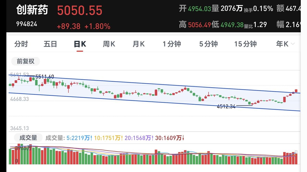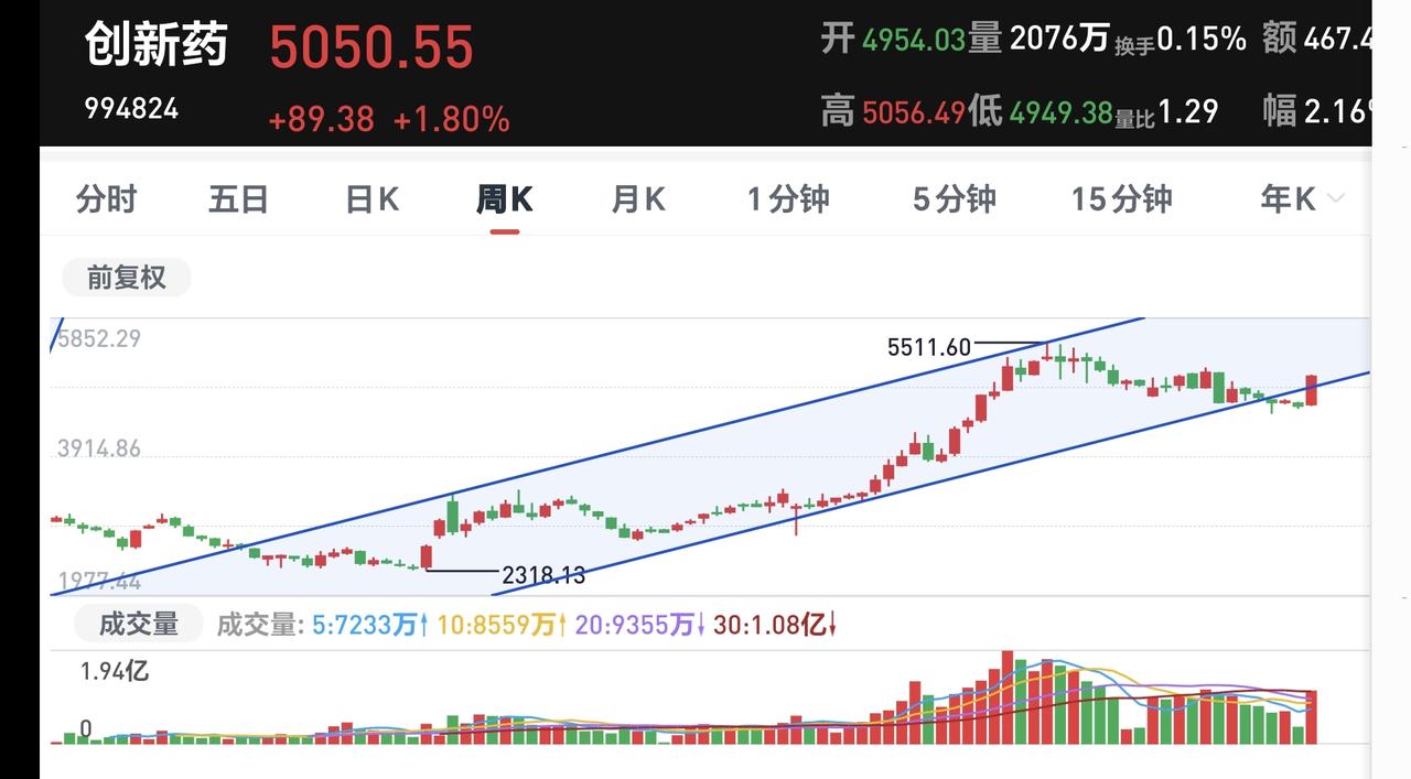 基金:创新药板块突破了下跌趋势 今天创新药板块也是上涨的,这是连续第5个交易日的上涨,现在盘中估值上涨了1.19%,这个板块今天加仓排行榜见下面的截图3,持有人数排行榜见下面的截图4,加仓人数最多的是富国医药创新股票,持有人数最多的是永赢医药创新智选混合。 我们来看一下下面的截图5,这是创新药板块日K线图,从图中可以看出,我画了两条倾斜向下的斜线,这是创新药板块日线级别下跌通道,今天的上涨突破了这个下跌通道的上轨,也就是说,创新药板块日线级别下跌趋势有可能已经被改变。按照规则,今天是可以进场的,但由于我认为近期大盘处在相对的高位,所以,我不准备这个时候进场。 我们来看一下下面的截图6,这是创新药板块周K线图,从图中可以看出,我画了两条倾斜向上的斜线,这是创新药板块周线级别上涨通道,前段时间下跌跌破了这个上涨通道的下轨,今天的上涨又回到了这个上涨通道内,所以,创新药板块周线级别有可能重新回到了上涨趋势中。 如果不考虑到大盘的位置,现在就是按照规则可以进场的时候,我还是想等一等,挣钱的事情不能着急。 我每天都会分享我的观点,我的观点只代表我个人的看法,不能作为你操作的依据,据此操作后果自负。