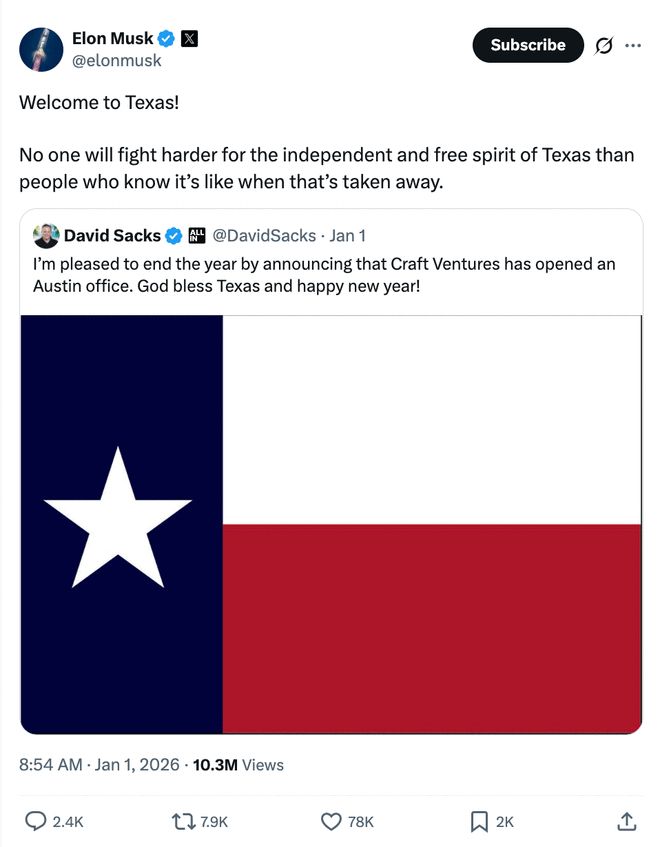 萨克斯更是跨年之际在社交媒体上贴出得克州州旗,并宣称“迈阿密将取代纽约,奥斯汀将取代旧金山”。