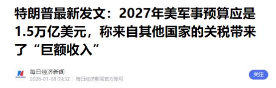 当地时间1月7日,特朗普公开发文表示:经过与参议员、众议员、部长和其他政治代表进行谈判。 他决定,为了国家的利益,尤其是在当前这个动荡不安、危机四伏的时期,2027年美国军事预算不应该是1万亿美元,而是1.5万亿美元。 特朗普在动态里直接说清了自己的底气在哪:要不是从其他国家收关税赚了一大笔,他本来就打算维持1万亿美元的预算。就是这笔额外的关税钱,让1.5万亿美元的军费目标变得能实现。 1.5万亿美元可不是小数,折成人民币都超过10万亿了,单看这个数字,就比全球绝大多数国家一年的GDP总量还高,跟其他国家的国防开支比更是差得离谱:法国2027年的国防预算大概640亿欧元,换算过来还不到700亿美元,美国这一笔军费,差不多能顶22个法国的国防预算总和。 要注意的是,这次军费加码不是孤立的政策,跟特朗普最近一连串激进的外交、军事动作都能对上。 就在同一天,他还密集推出了好几个重磅操作:签备忘录退出66个国际组织,跟哥伦比亚总统打破僵局通了电话,甚至公开质疑北约盟友是不是真的忠诚。 这一连串操作,把“美国优先”的霸权套路玩到了极致。而军费大幅提升,明显就是给这些激进动作撑场子的硬实力支撑。 特朗普还在动态里特意强调,这笔巨额军费要用来打造美国盼了很久的“理想军队”,更关键的是不管面对什么敌人,都能保证美国的安全。 军事观察人士都看出来了,美国这么做本质上就是想靠扩军备战稳住自己的全球霸主地位,同时逼着其他国家也跟着增加国防开支,这样就能削弱这些国家搞生产、惠民生的能力,在大国竞争里占上风。 从之前透出来的消息能看明白,这笔军费主要会花在五个关键方向:海陆空的主力舰艇和战机、更新核武库、升级导弹防御系统、打造远程打击火力,还有构建太空轨道体系和网络作战能力,每个方向都是实打实的烧钱项目。 拿空中力量建设来说,美国空军的第六代战斗机F-47已经定了让波音公司研发,单机预估造价就高达2.5到3亿美元,差不多是现在服役的F-35隐形战机的三倍。 而且美国空军计划采购的数量会比F-22战机还多,再加上配套的协同作战无人机,单这一项就要花几千亿美元。 海军的野心更大,已经定了个30年的造舰计划,想在2054年把舰艇数量从现在的295艘增加到390艘。美国国会预算办公室算过,扣掉要退役报废的船,未来30年得新建364艘舰艇,总花费可能会到1.2万亿美元。 另外,特朗普政府刚启动的“金穹”导弹防御系统,号称能给美国全境提供“从天到地”的全方位保护,美国媒体都把它叫做新世纪的“星球大战”计划,后续要花的钱更是没个准数。 军费大幅增加还在美国国内掀起了一连串反应,同一天特朗普就对美国最大的国防承包商之一雷神公司放话警告:如果雷神不停止回购股票,把更多利润拿出来扩建武器生产能力,美国政府就不再跟它合作。 他在社交平台上说得很明白,雷神要么站出来加大前期投入,比如建工厂、更设备,要么就彻底失去国防部的订单,还明确禁止雷神在把自己的问题理顺前再搞任何股票回购——毕竟这家公司之前已经花了几百亿美元回购股票了。 这话也暴露了美国军工复合体和政府之间的利益拉扯,之前特朗普就多次吐槽国防公司交付关键武器总是拖拖拉拉,却还一个劲给投资者发高额股息、回购股票,给高管发巨额薪资,这种资源配置的低效,让军费的实际作用打了很大折扣。 资本市场对这次军费调整的反应来得特别快,前一天晚上美股的国防军工股就集体走低:诺斯罗普·格鲁曼跌了5.5%,洛克希德·马丁跌了4.8%,雷神的母公司RTX跌了2.5%。投资者显然担心特朗普政府对军工企业的强硬态度会影响公司利润。 跟美股形成鲜明对比的是A股军工股,1月8日开盘后直接集体走强,Wind军工指数涨了超过4%,邵阳液压、哈焊华通这些个股直接涨停,江龙船艇、东土科技等多只股票涨幅也超过10%,中国一重、航天电器也跟着涨停了。 券商机构大多认为,新一轮的装备建设规划很快就要明确,军工板块会迎来国内国外需求的双重带动,值得布局,尤其是无人与反无人装备、深海科技、作战信息化这些新质生产力领域,还有民用两机业务和商业航天领域,都会有很大的发展空间。