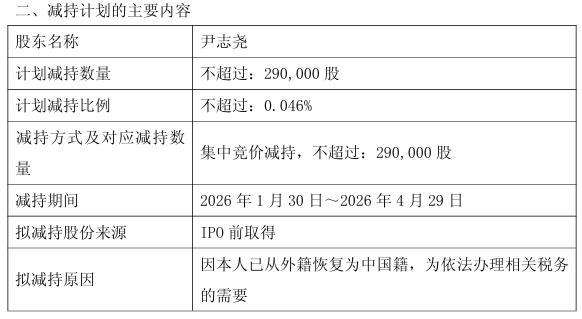公告显示,因尹志尧已从外籍恢复为中国籍,为依法办理相关税务的需要,计划自公告披露之日起15个交易日后的3个月内通过集中竞价等方式减持不超过29万股公司股份,占公司总股本比例0.046%。