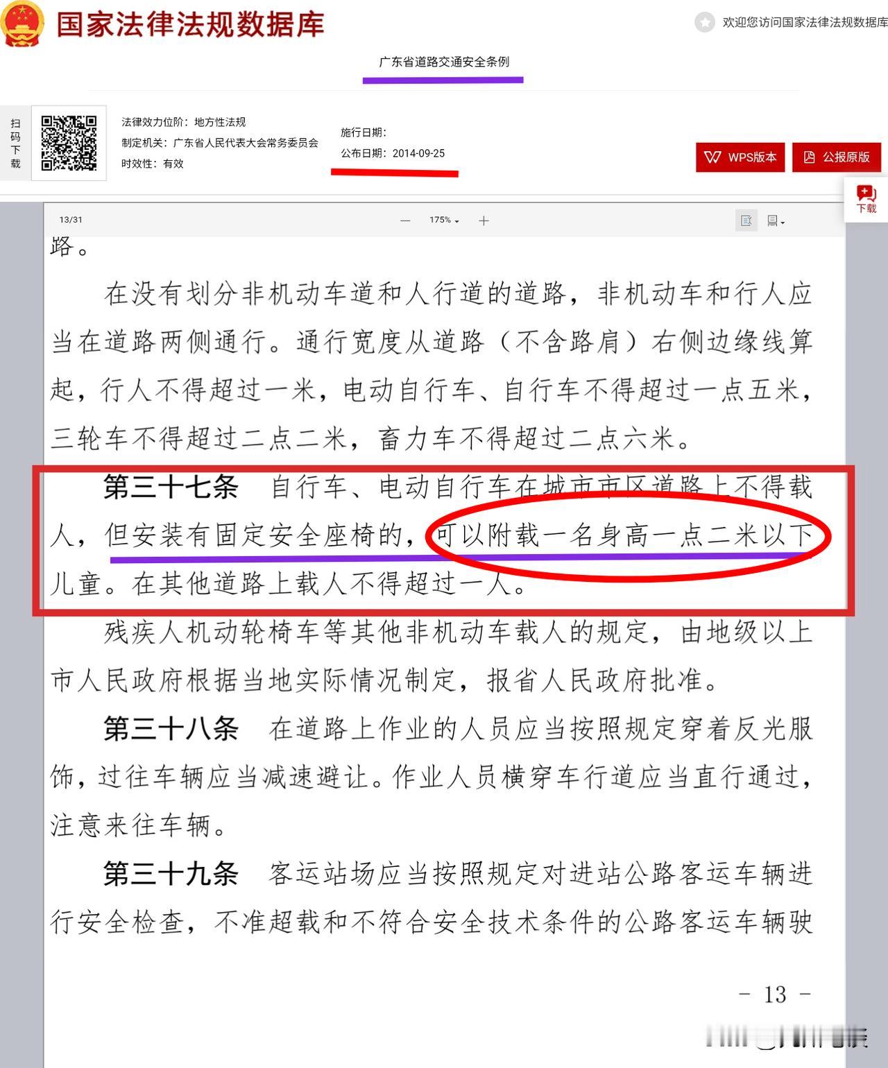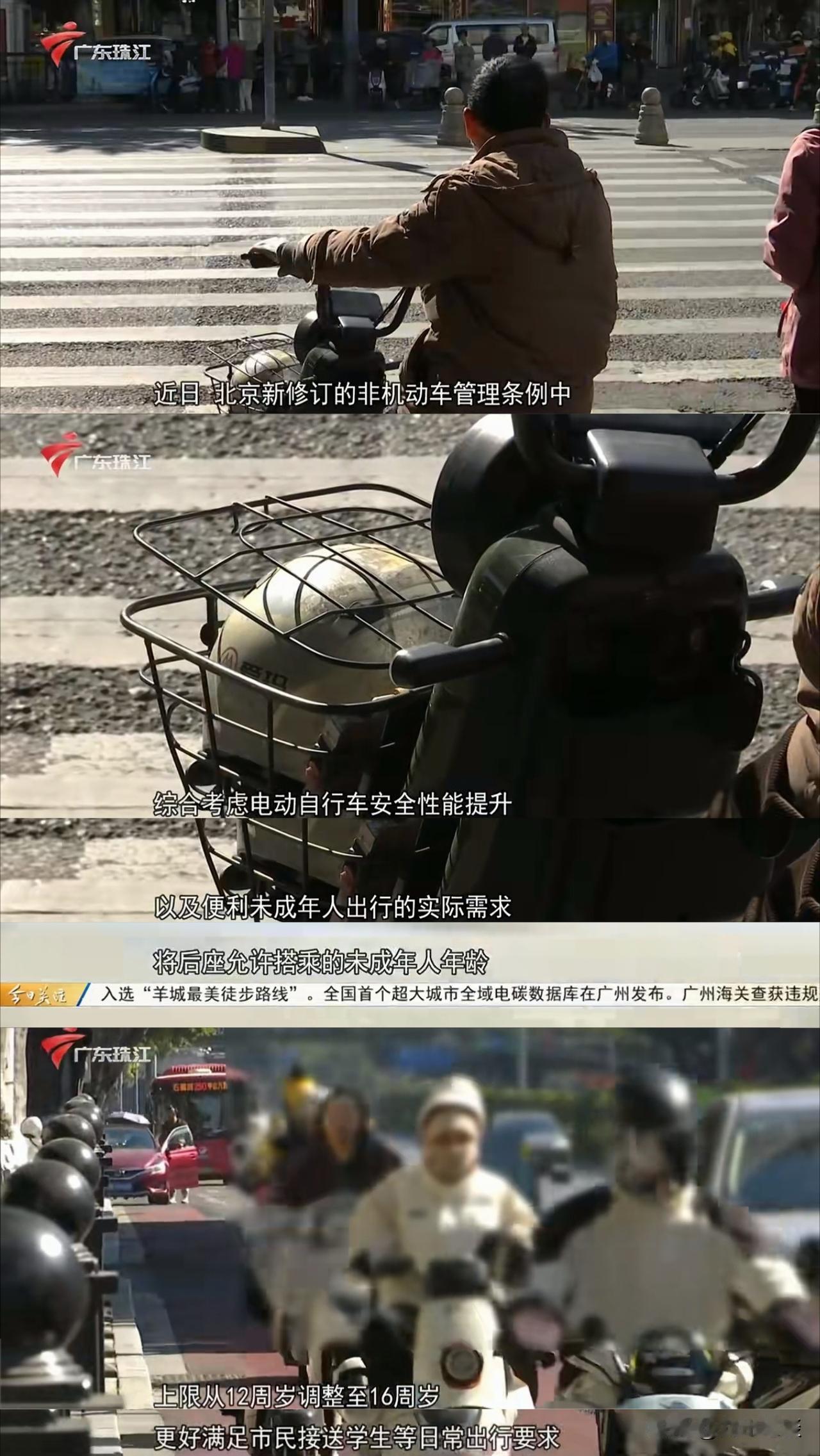 事关广东3000多万辆电动自行车,电动车载人标准提高到16周岁,粤西、粤北、粤东会拖后腿吗? 广东或跟随北京脚步,把电动自行车载人标准从全国最低的1.2米提高到16周岁! 自古燕赵民风彪悍、勇猛,虽然北京高山也不少,北部、西部、东部都有山区,冬天还有寒风刺骨,冰天雪地,对电动车骑行造成很大困难,但北京并没有因为条件所限就限制电动车载人标准仅仅限于12周岁以下。 依然提高了电动自行车载人标准,从12周岁提高到16周岁,满足首都群众的接送孩子实际需求。 之前江淮勇士多的江苏省,遍地是山的福建省,也把电动自行车载人标准提高到了16周岁。 唯独我们大广东,还守着落后于全国的标准,只能搭载1.2米的儿童,也就是学龄前的儿童,小学生都不能用电动车接送。 专家说因为大家经常不戴头盔,为了安全着想,要限制载人标准。 现在珠三角已经满足条件了,大部分骑乘人员都戴头盔,可以提高载人标准了。 就看非珠三角地区,是否具备提高载人标准的条件了。 广州、深圳等地方电动自行车管理规定,无法突破省里的规定,只能限制在1.2米以下。 还是需要全省都提高标准才行,也就是广东省电动自行车管理规定提高标准才行。 也就是修订广东省道路交通安全条例第三十七条,把载人标准从1.2米改成到16周岁。 实际上,根本没有人理会这个规定,别说1.2米了,早就超过标准的小学生、初高中生也用电动车接送。