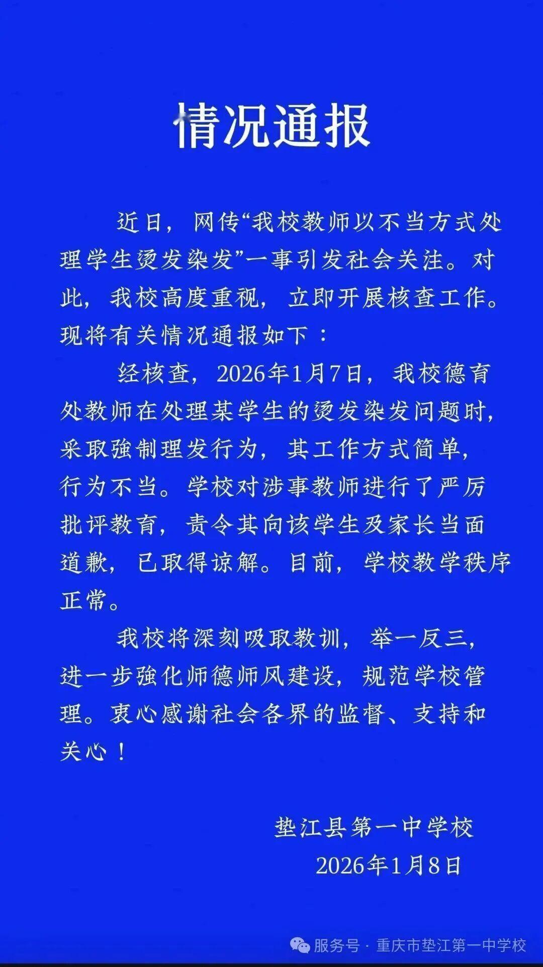 都2026年了,还有学校搞强制剪发这一套?重庆一中学为了学生剪发,多名学生被按倒在地……这事看着是剪头发,实则是把学生的尊严按在地上摩擦。根子上是教育理念还活在过去——把“管住外表”当成了“管住思想”,以为整齐划一就是教育成功,却忘了尊重个性才是教育的起点。 一些学校的管理思维还停留在二十年前,校规大过法律,老师觉得有权处置学生身体,却忘了《未成年人保护法》明确禁止侮辱人格。这种“服从教育”的思维,本质上是对失控的恐惧。 更可悲的是违法成本太低。出了事,一句“批评教育”就算交代,难以形成震慑。今天能按头剪发,明天就可能有更过分的举动。教育不该是驯服,而是唤醒。初中生理发 高中强制理发