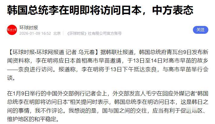 李在明13日访日引关注,韩日峰会聚焦地区与经济议题!   1月9日,韩国总统办公室正式发布声明,宣布总统李在明将于下周二(1月13日)启程前往日本,展开为期两天的国事访问,期间将与日本首相高市早苗举行关键峰会。   根据官方声明内容,此次韩日峰会将选址日本奈良市,1月13日当天,两国领导人完成会谈后还将共进晚餐。从议程安排来看,双方计划围绕地区和国际事务深入交换意见,同时就经济合作、社会发展等务实议题展开磋商。   作为2026年韩日高层的首次正式会面,这场访问承载着推动双边关系稳定发展的重要使命,每一个细节都备受瞩目。   从时间节点来看,此次访问距离李在明当选韩国总统已有半年多时间,随着韩国国内施政逐步步入正轨,梳理并推进与邻国的关系成为其外交工作的重要方向。   从双方预计讨论的议题来看,此次峰会的务实导向十分明显。经济领域韩日作为东北亚的重要经济体,在半导体、新能源、汽车制造等多个领域存在竞争与合作的双重关系。   而在地区和国际事务方面,朝鲜半岛局势、东北亚安全稳定、气候变化等议题大概率会被纳入讨论范围。   值得注意的是,此次访问发生在李在明近期访华之后,其外交布局的连贯性备受关注。   此前李在明访华期间,中韩双方达成多项合作共识,推动双边关系迎来回暖。此次转访日本,既体现了韩国“实用外交”的思路,也折射出东北亚国家间相互协作、共促发展的普遍期待。   不过,韩日之间仍存在历史遗留问题等分歧,此次峰会能否为解决这些问题奠定基础,还有待观察,且因为中日关系近期十分紧张,李在明如何处理好自己在中日之间的站位也备受关注。   而除了与高市早苗的会谈,李在明在访日期间还将出席友好交流活动,并与旅日韩国侨胞举行座谈会,全方位增进韩国与日本社会各界的沟通了解。   李在明此次访日是2026年东北亚外交的重要开篇。无论是双边关系的推进,还是地区议题的协调,这场峰会都承载着诸多关注。