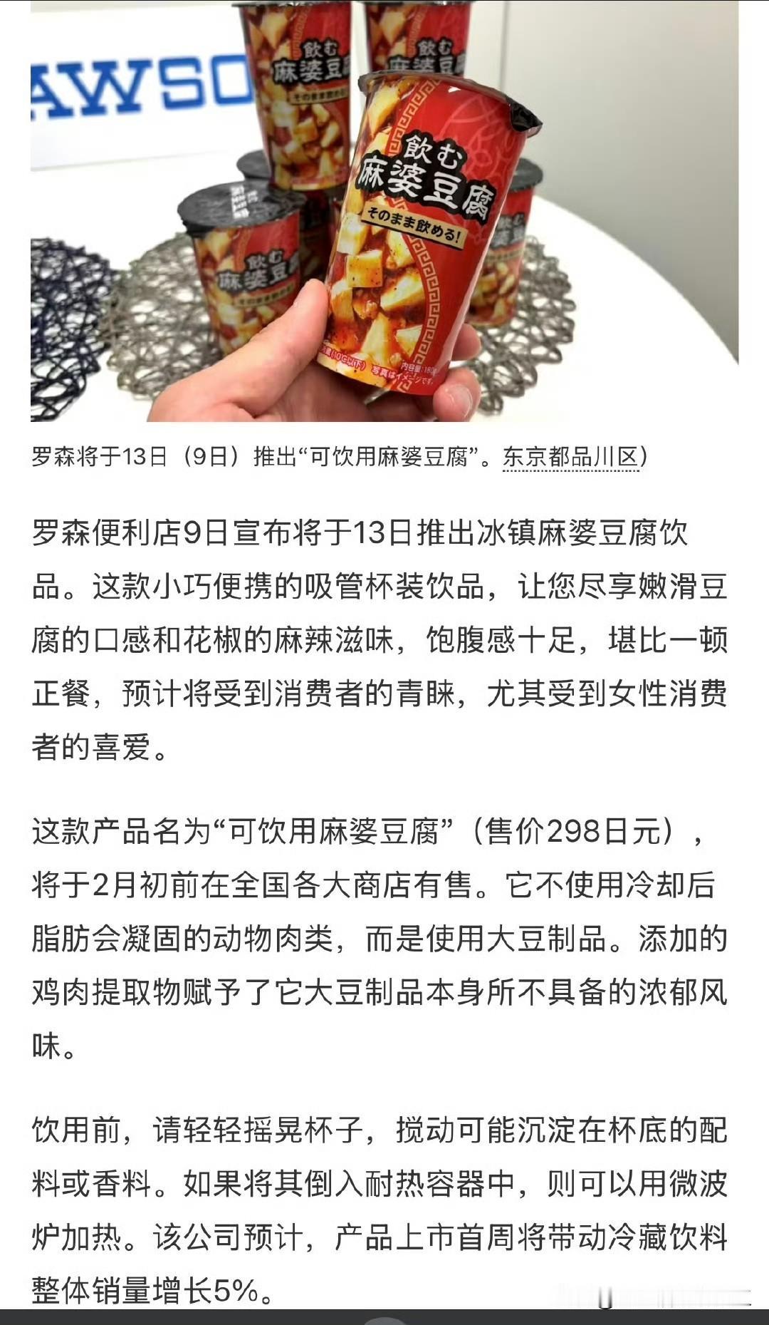 1月13日星期二起罗森门店推出 冷藏饮料“可饮用麻婆豆腐”(含税298日元) 有人喜欢吗???