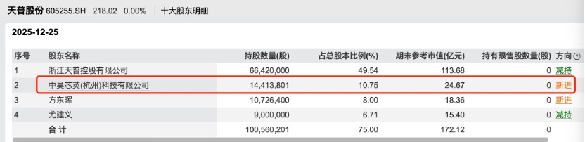 根据最新公告披露,中昊芯英成为天普股份第二大股东,持股数量1441.38万股,持股占比10.75%。