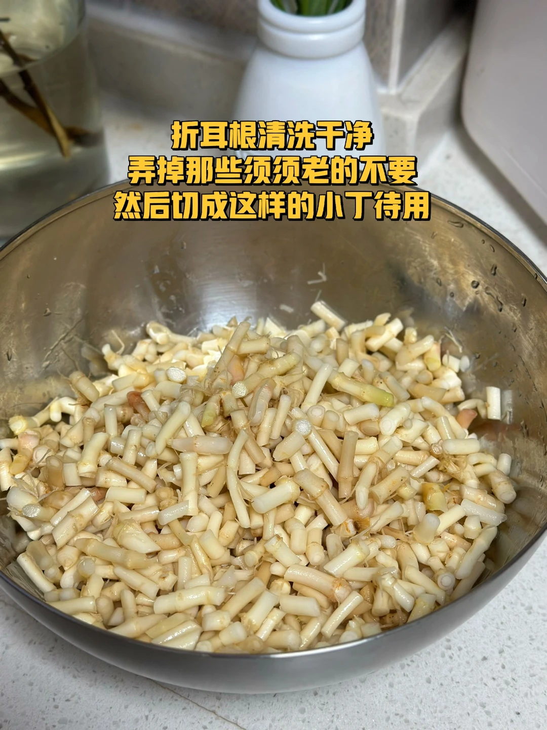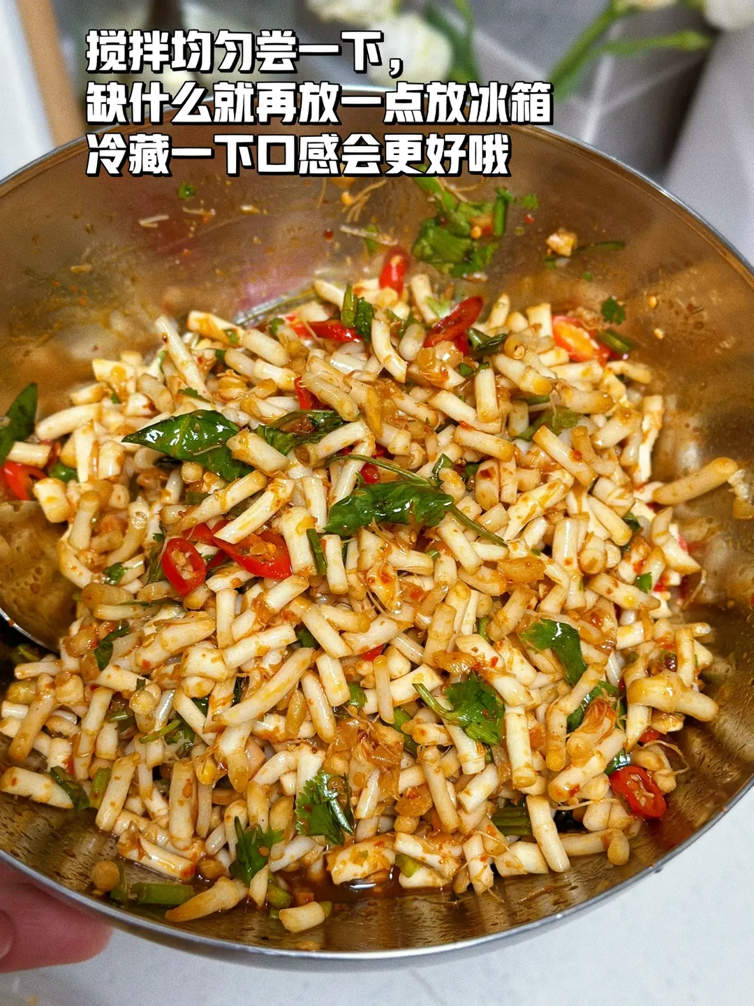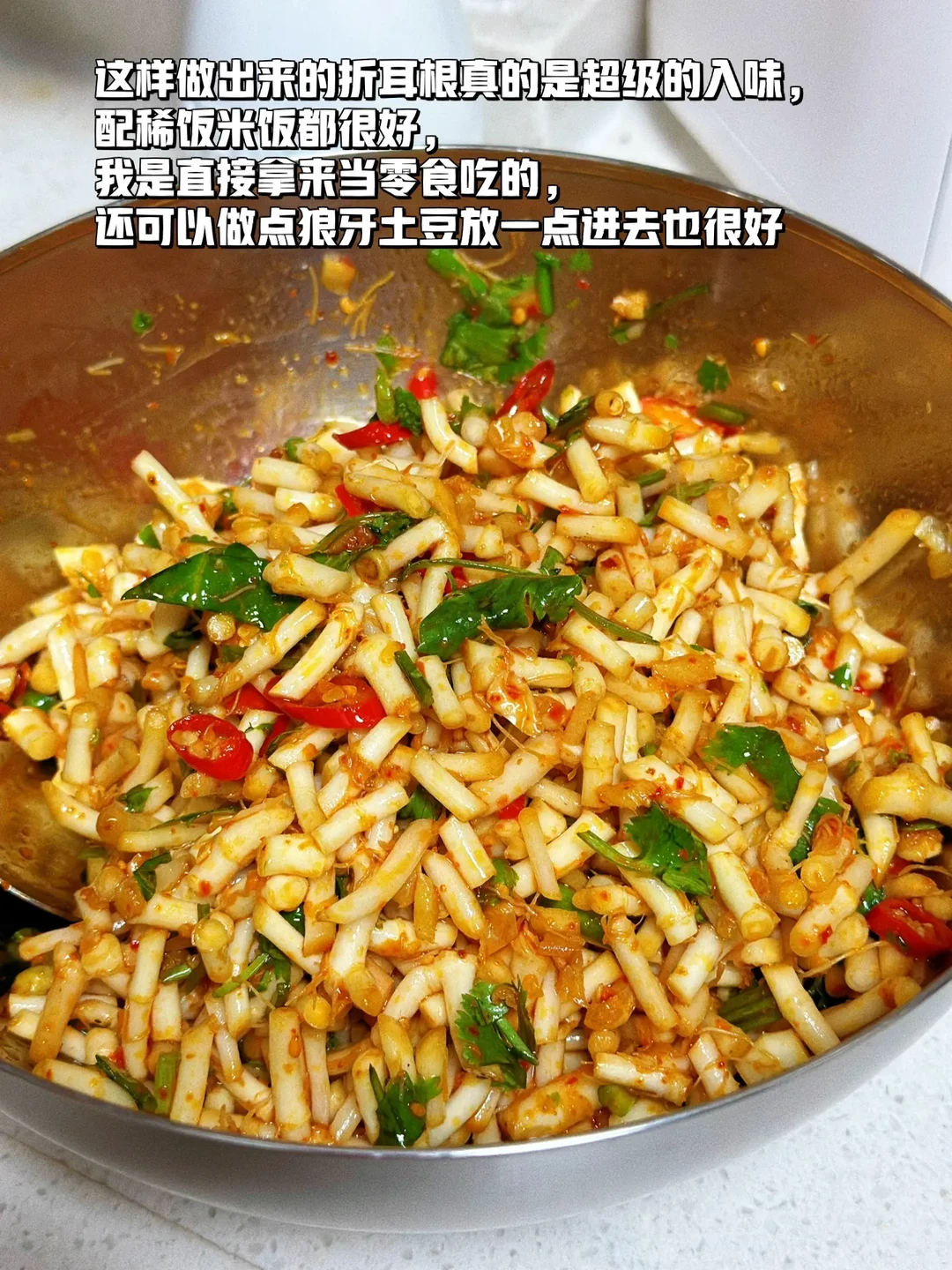 凉拌折耳根 折耳根真的是一个让人又恨又爱的东西,喜欢的人喜欢的不得了,不喜欢的人闻到味道就不行了,其实小的时候乡下田梗上很多的,但那个时候不知道可以吃,只是经常会拿来煮水喝对身体好,出来之后才知道这个这东西凉拌这么好吃,一发不可收拾了 1. 今天去菜市场居然看见有折耳根卖看上去还挺嫩八块多钱一斤,买了一点凉拌吃,留了一些煮茶喝春季到了容易上火 2. 折耳根清洗干净弄掉那些须须老的不要然后切成这样的小丁待用 3. 大蒜生姜切小碎喜欢吃辣的小米辣可以多切一些 4. 折耳根的碗里面加入一勺生抽一勺蚝油一丢丢香醋,少许糖盐鸡粉一勺麻油 5. 小火爆香大蒜生姜末小米辣碎这样能很好的去除小米辣的生辣味也会更香 6. 这个是我自己做的辣椒油买的那种爆辣的辣椒 7. 炒好的小米辣大蒜生姜碎一点点的香菜碎全部都放进去再放入两勺辣椒油 8. 搅拌均匀尝一下,缺什么就再放一点放冰箱冷藏一下口感会更好哦 这样做出来的折耳根真的是超级的入味,配稀饭米饭都很好,我是直接拿来当零食吃的,还可以做点狼牙土豆放一点进去也很好