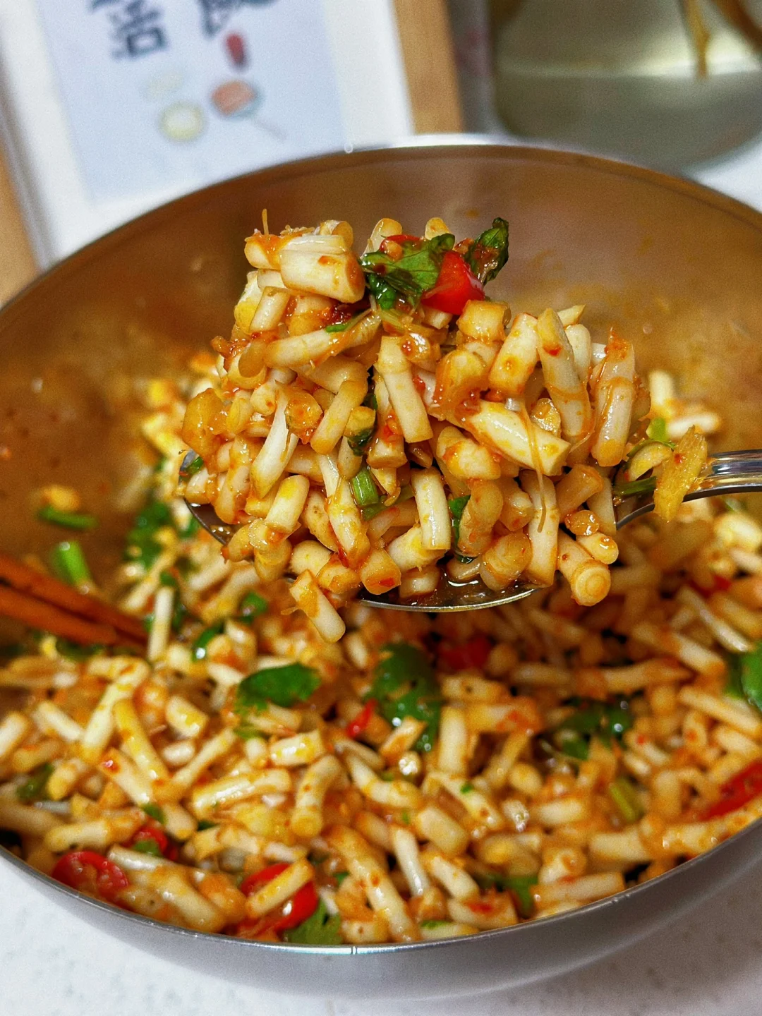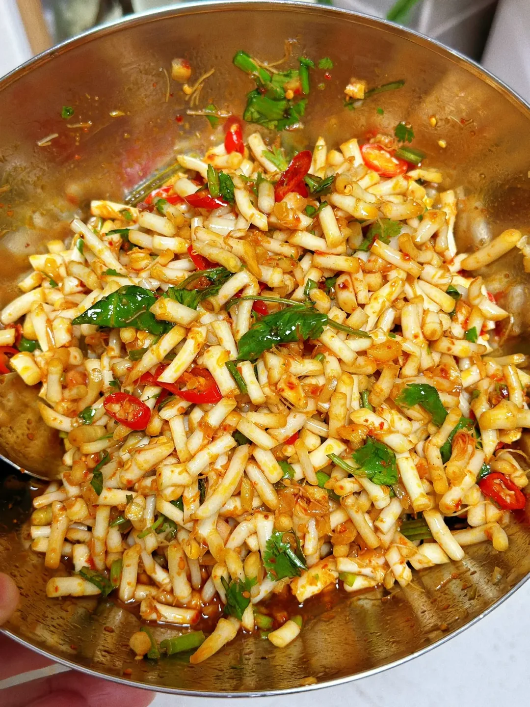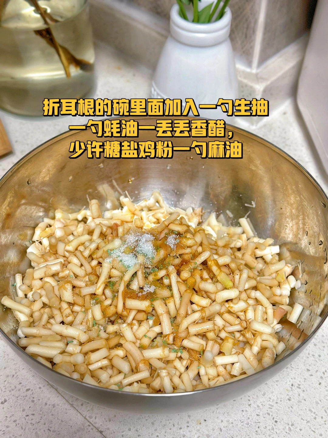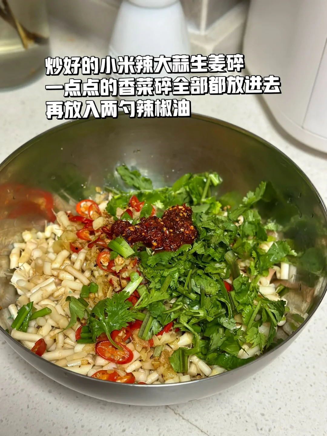 凉拌折耳根 折耳根真的是一个让人又恨又爱的东西,喜欢的人喜欢的不得了,不喜欢的人闻到味道就不行了,其实小的时候乡下田梗上很多的,但那个时候不知道可以吃,只是经常会拿来煮水喝对身体好,出来之后才知道这个这东西凉拌这么好吃,一发不可收拾了 1. 今天去菜市场居然看见有折耳根卖看上去还挺嫩八块多钱一斤,买了一点凉拌吃,留了一些煮茶喝春季到了容易上火 2. 折耳根清洗干净弄掉那些须须老的不要然后切成这样的小丁待用 3. 大蒜生姜切小碎喜欢吃辣的小米辣可以多切一些 4. 折耳根的碗里面加入一勺生抽一勺蚝油一丢丢香醋,少许糖盐鸡粉一勺麻油 5. 小火爆香大蒜生姜末小米辣碎这样能很好的去除小米辣的生辣味也会更香 6. 这个是我自己做的辣椒油买的那种爆辣的辣椒 7. 炒好的小米辣大蒜生姜碎一点点的香菜碎全部都放进去再放入两勺辣椒油 8. 搅拌均匀尝一下,缺什么就再放一点放冰箱冷藏一下口感会更好哦 这样做出来的折耳根真的是超级的入味,配稀饭米饭都很好,我是直接拿来当零食吃的,还可以做点狼牙土豆放一点进去也很好