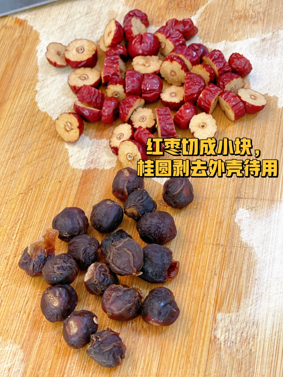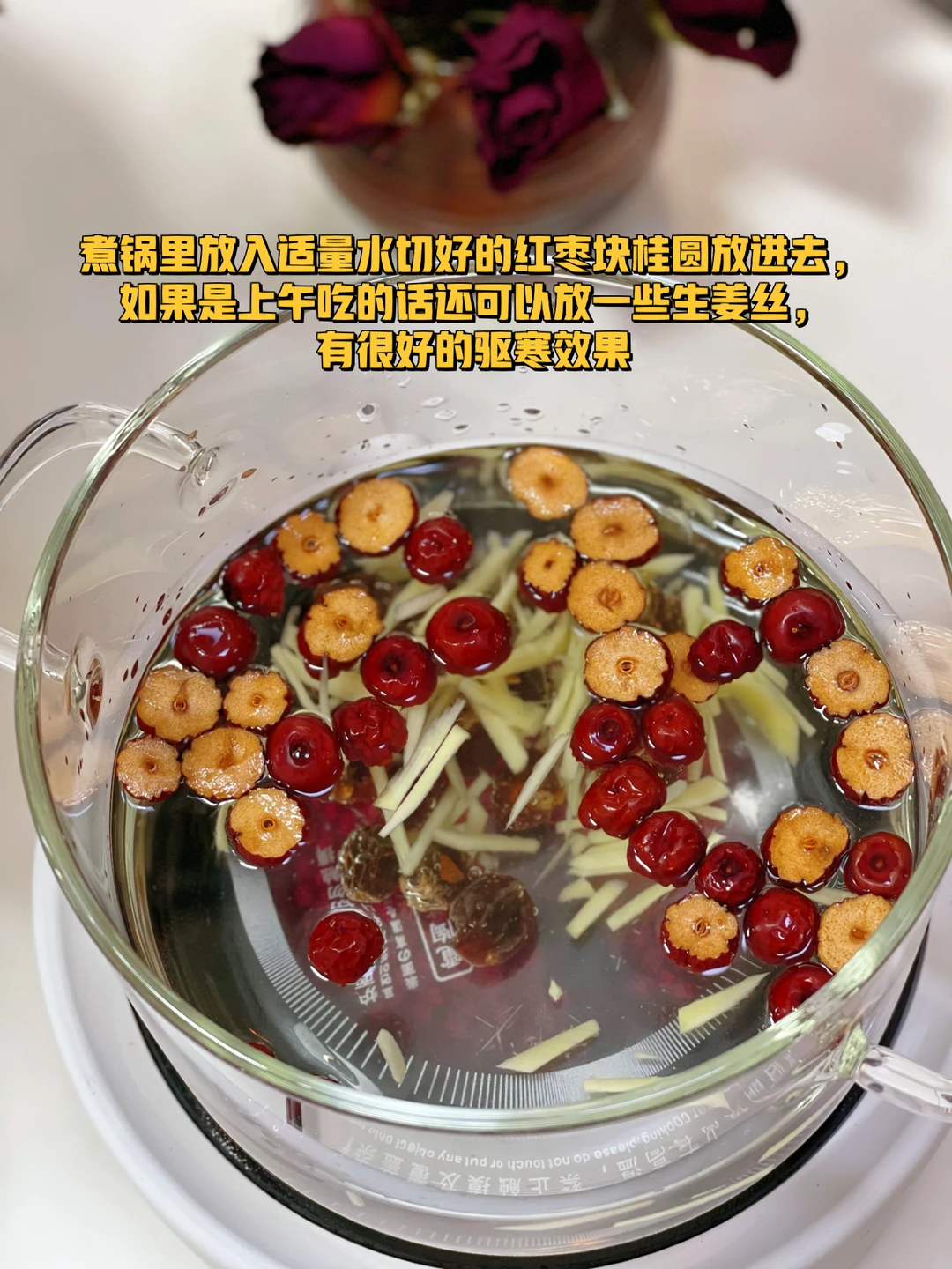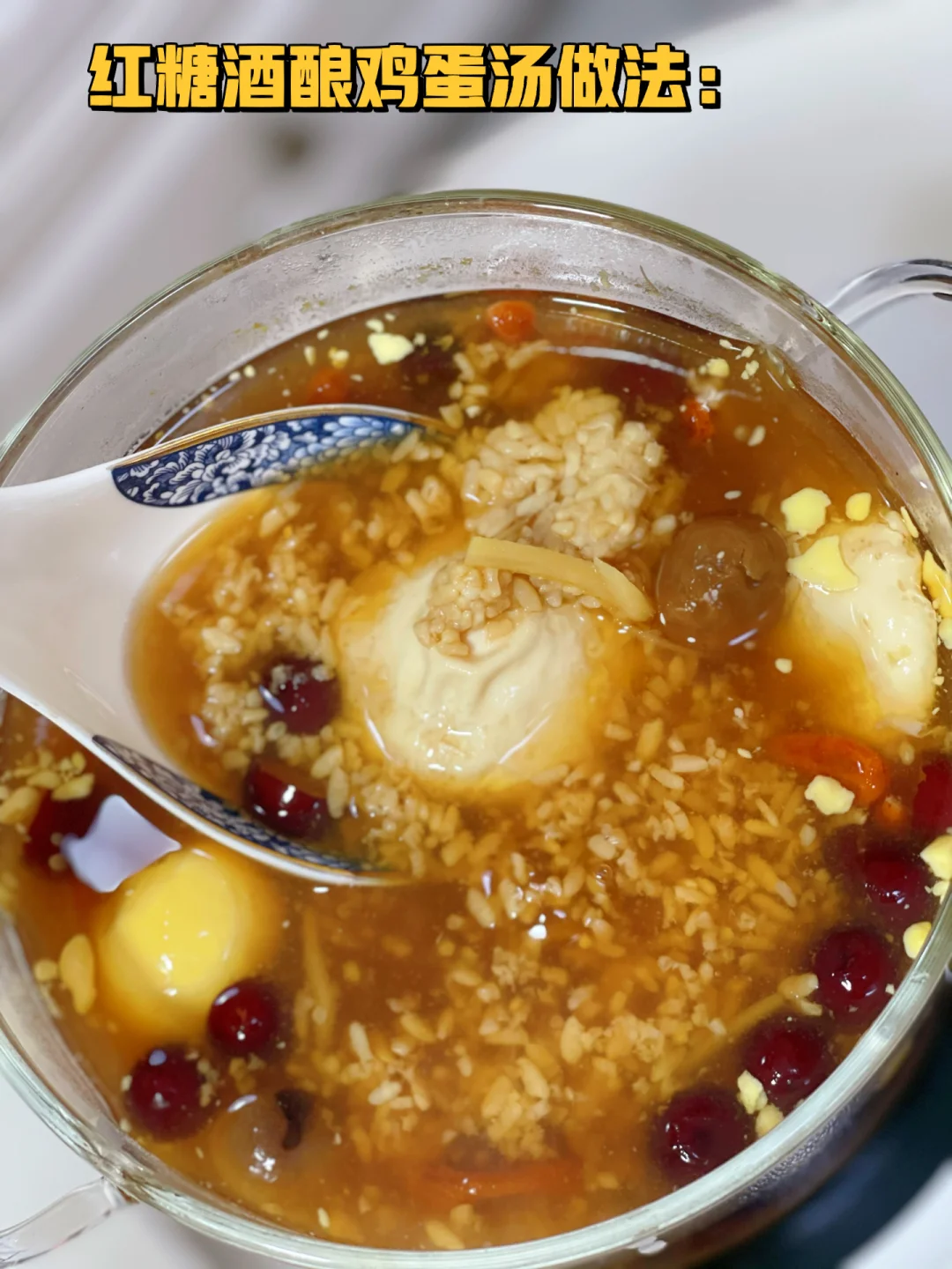 这一款汤女生一定要多喝,益气养颜,健脾健胃,改善月经疼痛的功效,我有的时候下午茶或者生理期前后我都会喝做法也超级简单,只不过酒酿是我自己做的,可能会更好一些,没有任何添加剂 1. 煮锅里加入适量水,然后再放入少许盐煮开 2. 小碗里放入半勺水鸡蛋磕进去,然后烧开的水关掉火,再把鸡蛋贴着水面轻轻的倒进去,然后盖上盖子焖四分钟左右成型就可以捞出来了 3. 红枣切成小块,桂圆剥去外壳待用 4. 煮锅里放入适量水切好的红枣块桂圆放进去,如果是上午吃的话还可以放一些生姜丝,有很好的驱寒效果 5. 我用的是这种古法红糖哦 6. 红糖块放进去中小火煮20分钟左右 7. 再把酒酿放进去,我是自己做的,你们可以去菜市场买现成的就可以 8. 如果你们喜欢吃浓稠一点的,还可以放一点藕粉放进去噢,生理期必喝的汤汤哦