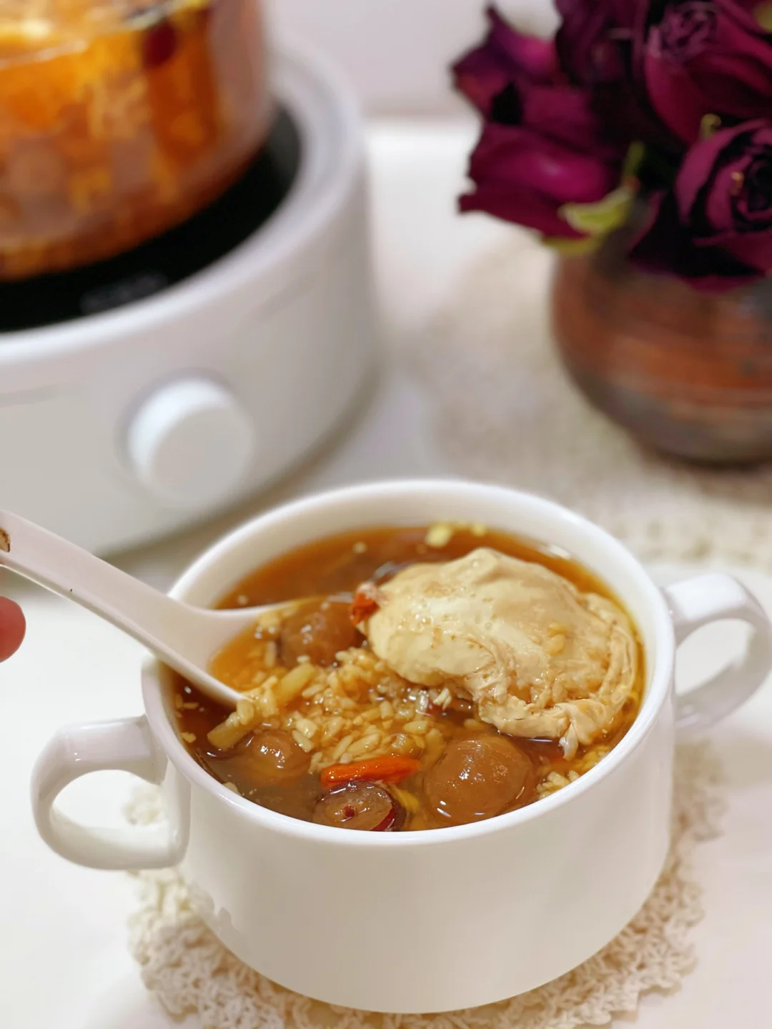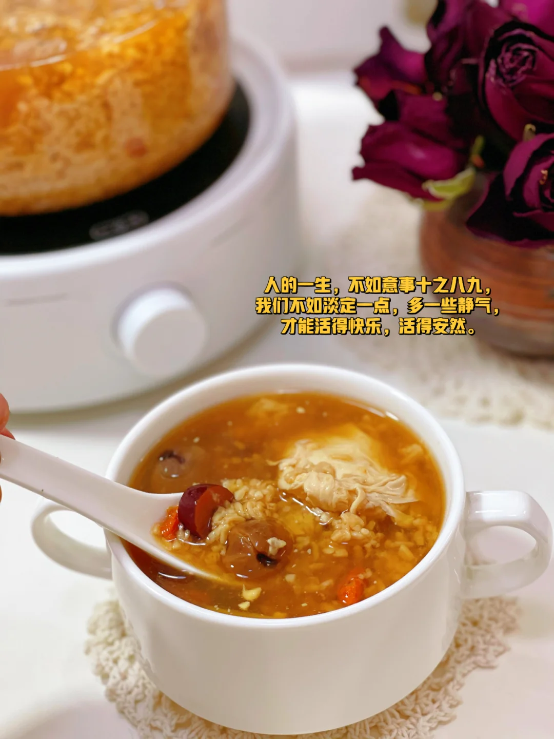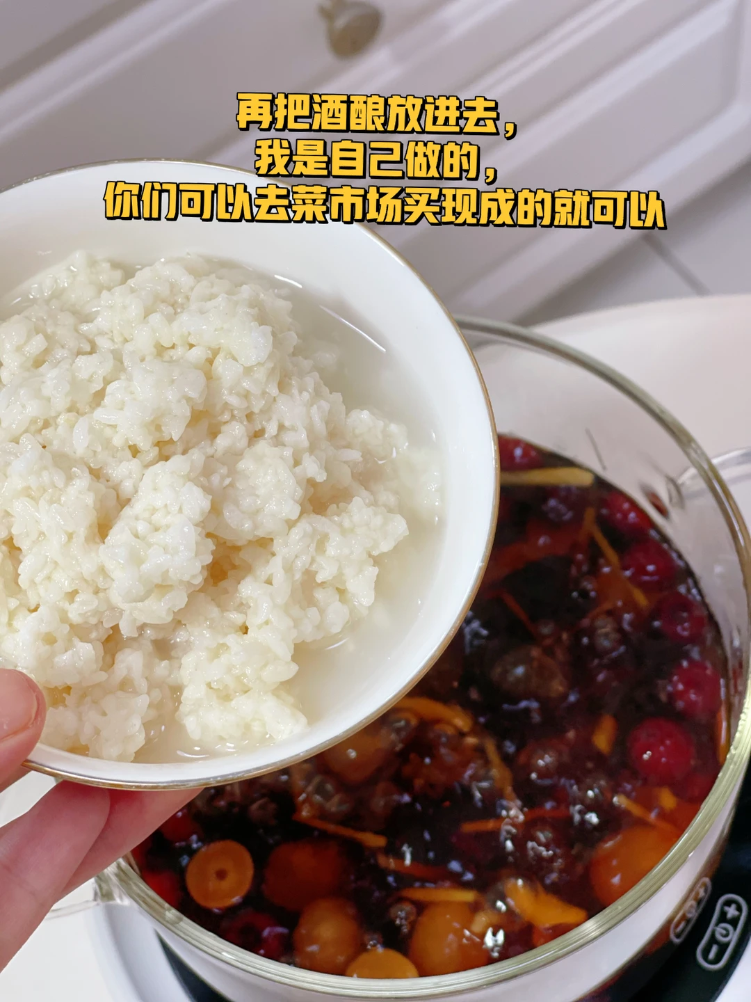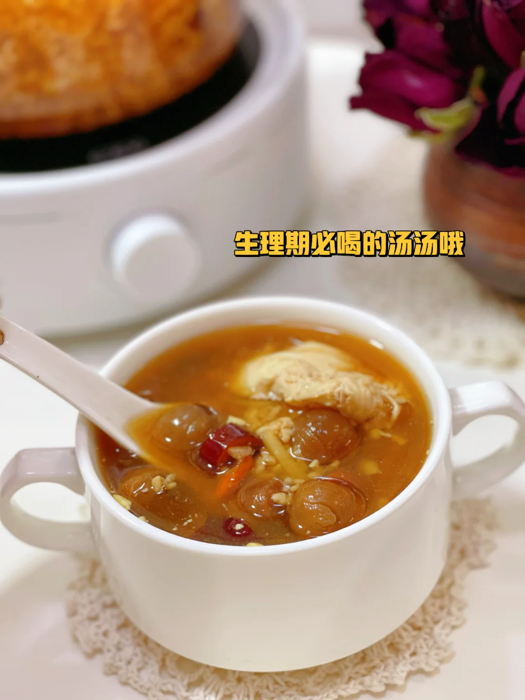 这一款汤女生一定要多喝,益气养颜,健脾健胃,改善月经疼痛的功效,我有的时候下午茶或者生理期前后我都会喝做法也超级简单,只不过酒酿是我自己做的,可能会更好一些,没有任何添加剂 1. 煮锅里加入适量水,然后再放入少许盐煮开 2. 小碗里放入半勺水鸡蛋磕进去,然后烧开的水关掉火,再把鸡蛋贴着水面轻轻的倒进去,然后盖上盖子焖四分钟左右成型就可以捞出来了 3. 红枣切成小块,桂圆剥去外壳待用 4. 煮锅里放入适量水切好的红枣块桂圆放进去,如果是上午吃的话还可以放一些生姜丝,有很好的驱寒效果 5. 我用的是这种古法红糖哦 6. 红糖块放进去中小火煮20分钟左右 7. 再把酒酿放进去,我是自己做的,你们可以去菜市场买现成的就可以 8. 如果你们喜欢吃浓稠一点的,还可以放一点藕粉放进去噢,生理期必喝的汤汤哦