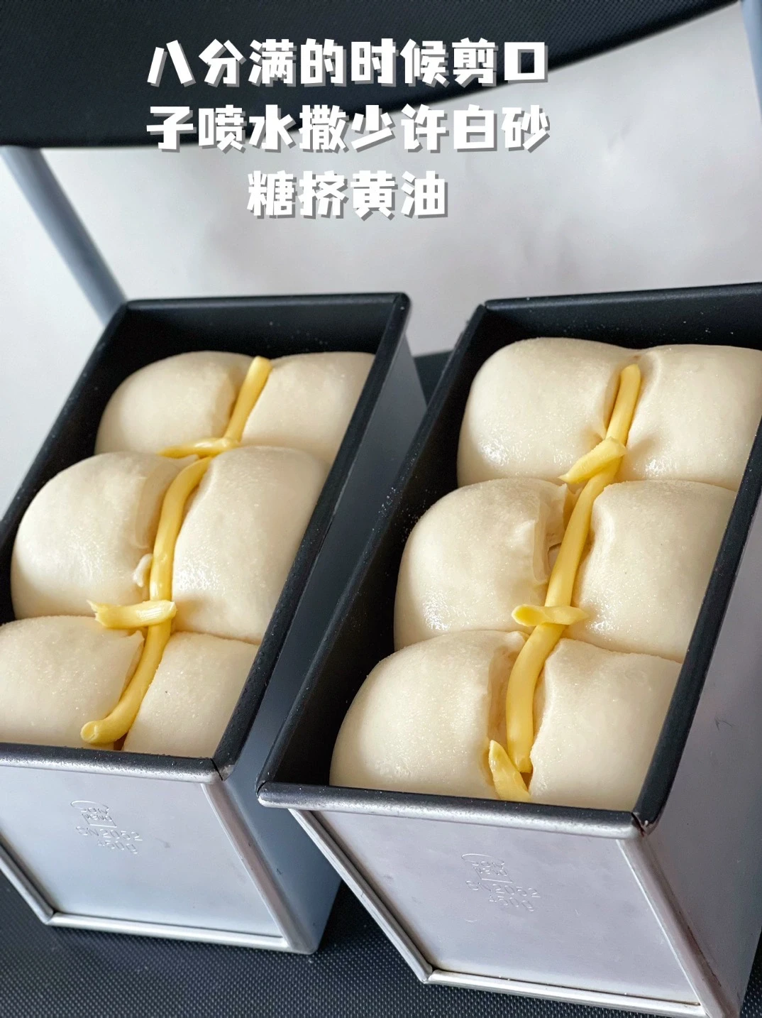 新买的鲜酵母到了又可以撸吐司了,配方分享给大家,今天做的是口感超级软的皇后吐司 主面团: 500g高筋面粉、60g白砂糖、50g黄油、 15g鲜酵母(或5g耐高糖干酵母)、8g 盐、50g全蛋 液、15g 奶粉、300g 牛奶(液体量不绝对每种面粉吸水量不一样) 其他的都是正常操作,就是二发好了以后喷水剪刀剪口子撒白糖挤黄油 烘烤时间按你们自己烤箱温度时间来就可以 我家的是风炉150度20分钟转140度10分钟就可以出炉了