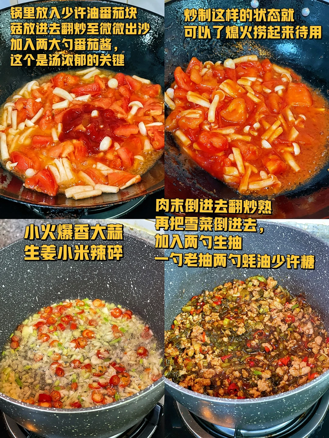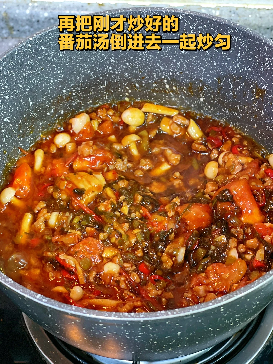 8. 再把刚才炒好的番茄汤倒进去一起炒匀