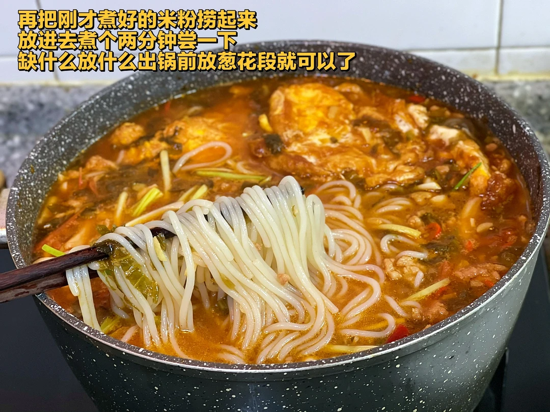10. 再把刚才煮好的米粉捞起来放进去煮个两分钟尝一下缺什么放什么出锅前放葱花段就可以了