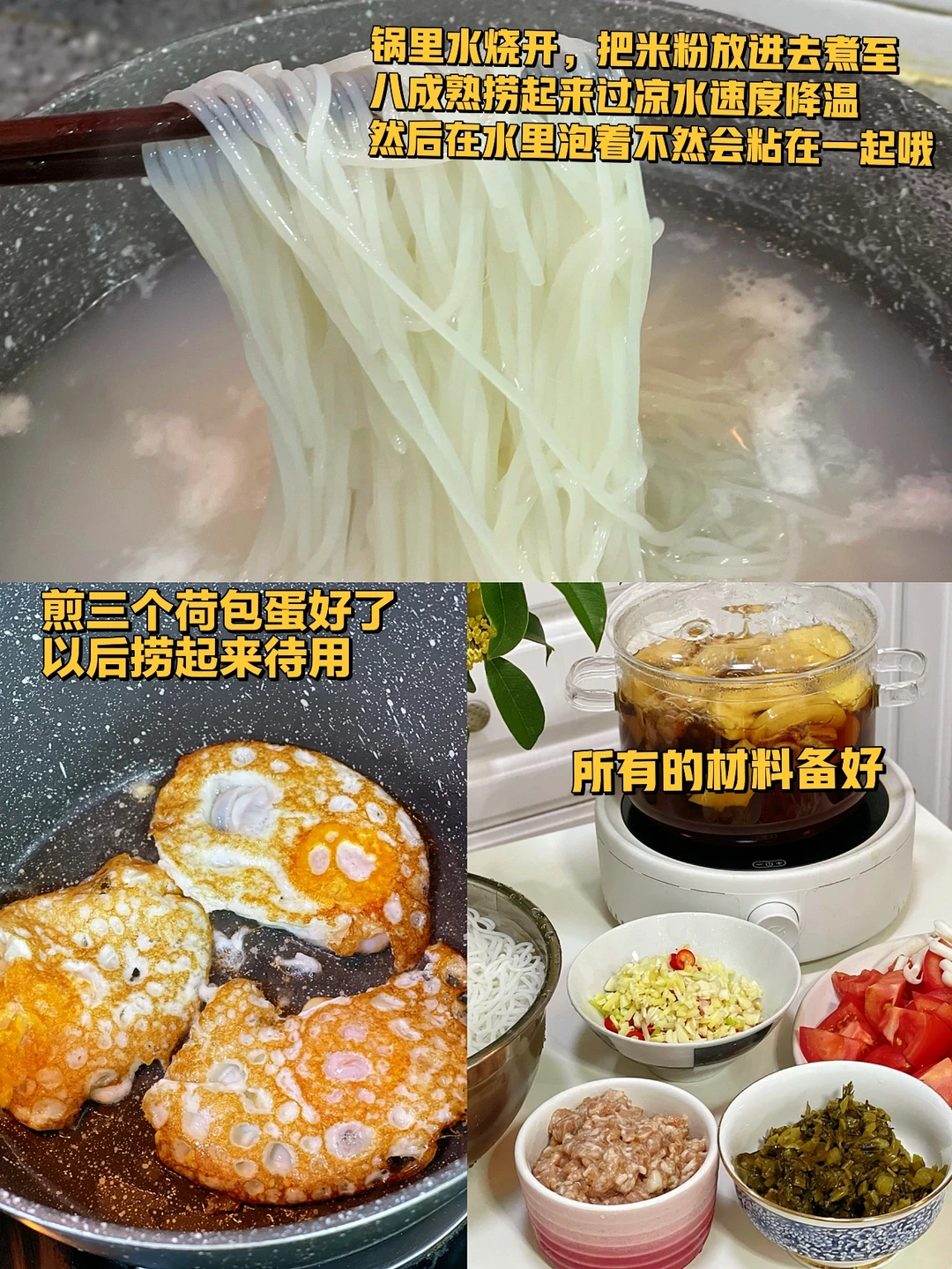 1. 锅里水烧开,把米粉放进去煮至八成熟捞起来过凉水速度降温然后在水里泡着不然会粘在一起哦